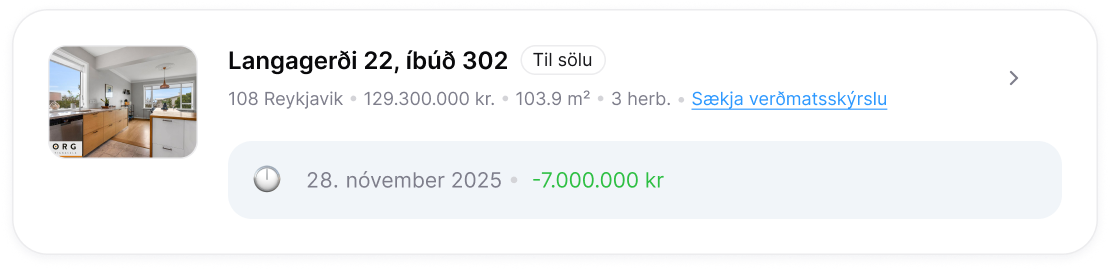 Vöktun fylgist með öllum verðbreytingum en þú getur einnig séð alla verðsöguna aftur í tímann. Þar sérðu hvernig ásett verð, fermetraverð og söluskráningin sjálf þróast.