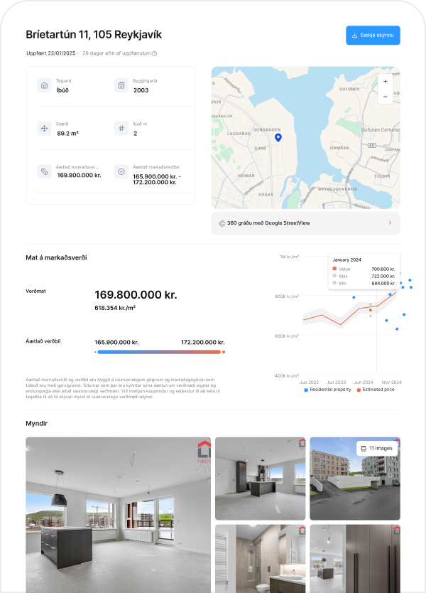 Þú getur sótt verðmat á hvaða eign sem er með áskrift að Aurbjörgu. Í hverjum mánuði færð þú þrjár verðmatsskýrslur sem þú getur nýtt til að sjá hvort ásett verð sé yfir eða undir áætluðu markaðsvirði. Það getur verið gagnlegt áður en þú gerir tilboð í draumaeignina.