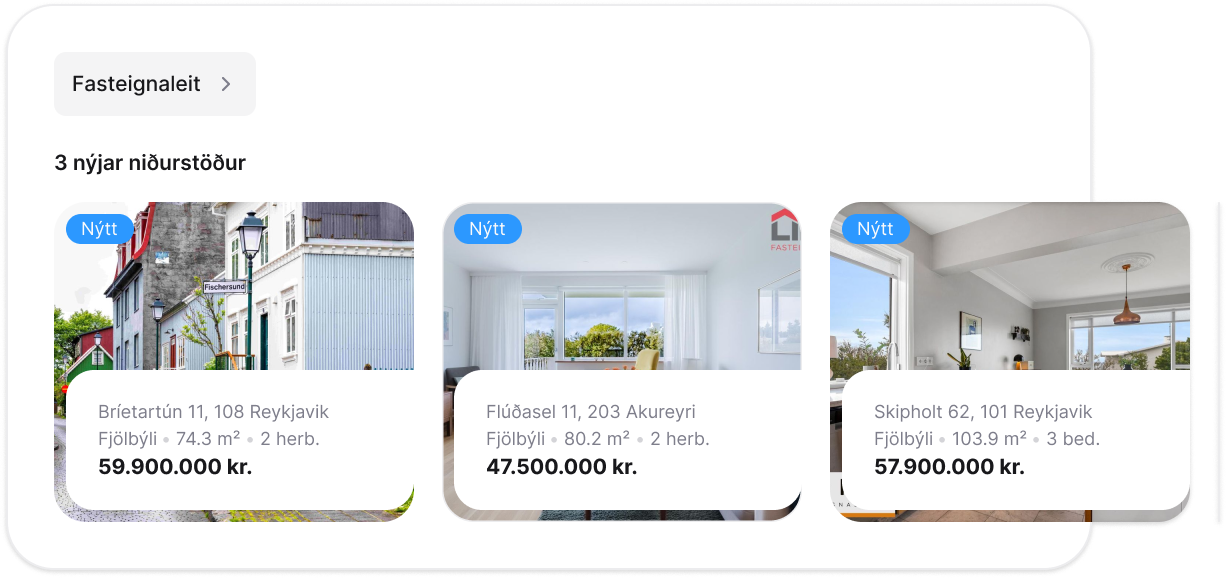 Þú setur inn leitarskilyrði og við fylgjumst með fasteignamarkaðnum fyrir þig og látum þig vita þegar drauma tækifærið birtist. Svo þegar þú hefur fundið eign sem þér líst vel á getur þú sett hana í vöktun og við fylgjumst með verðbreytingum, söluverði og öðrum hreyfingum.
