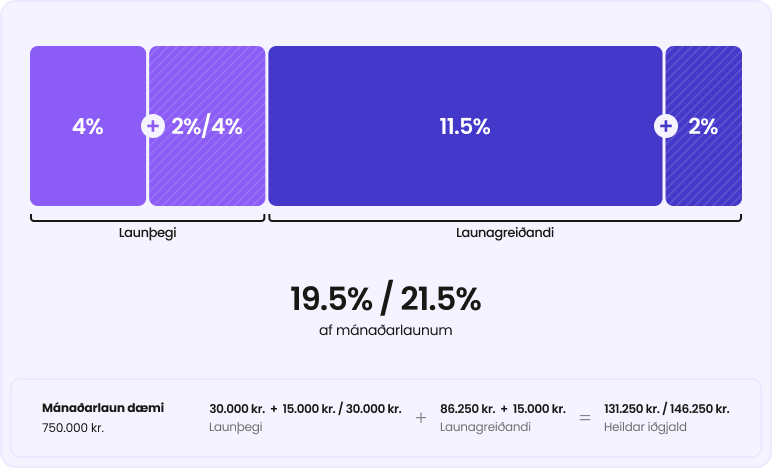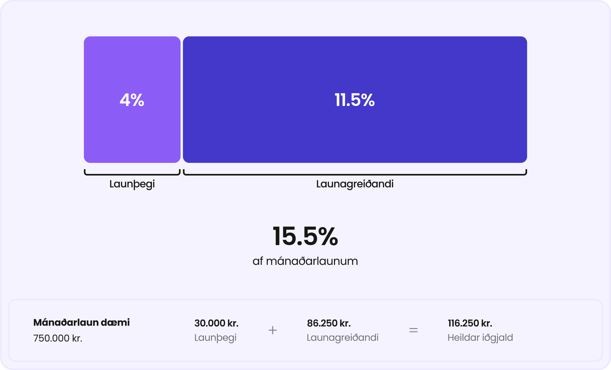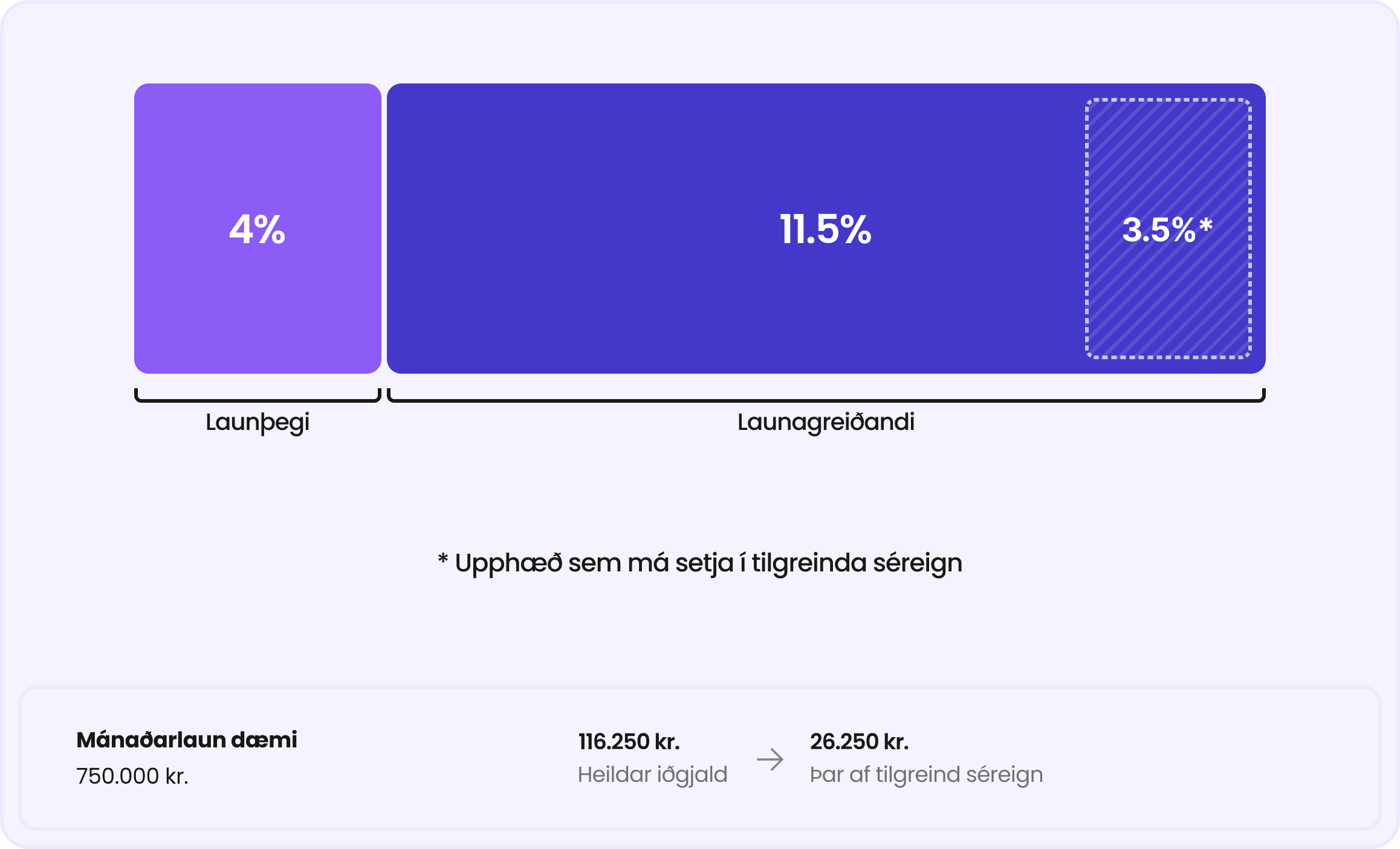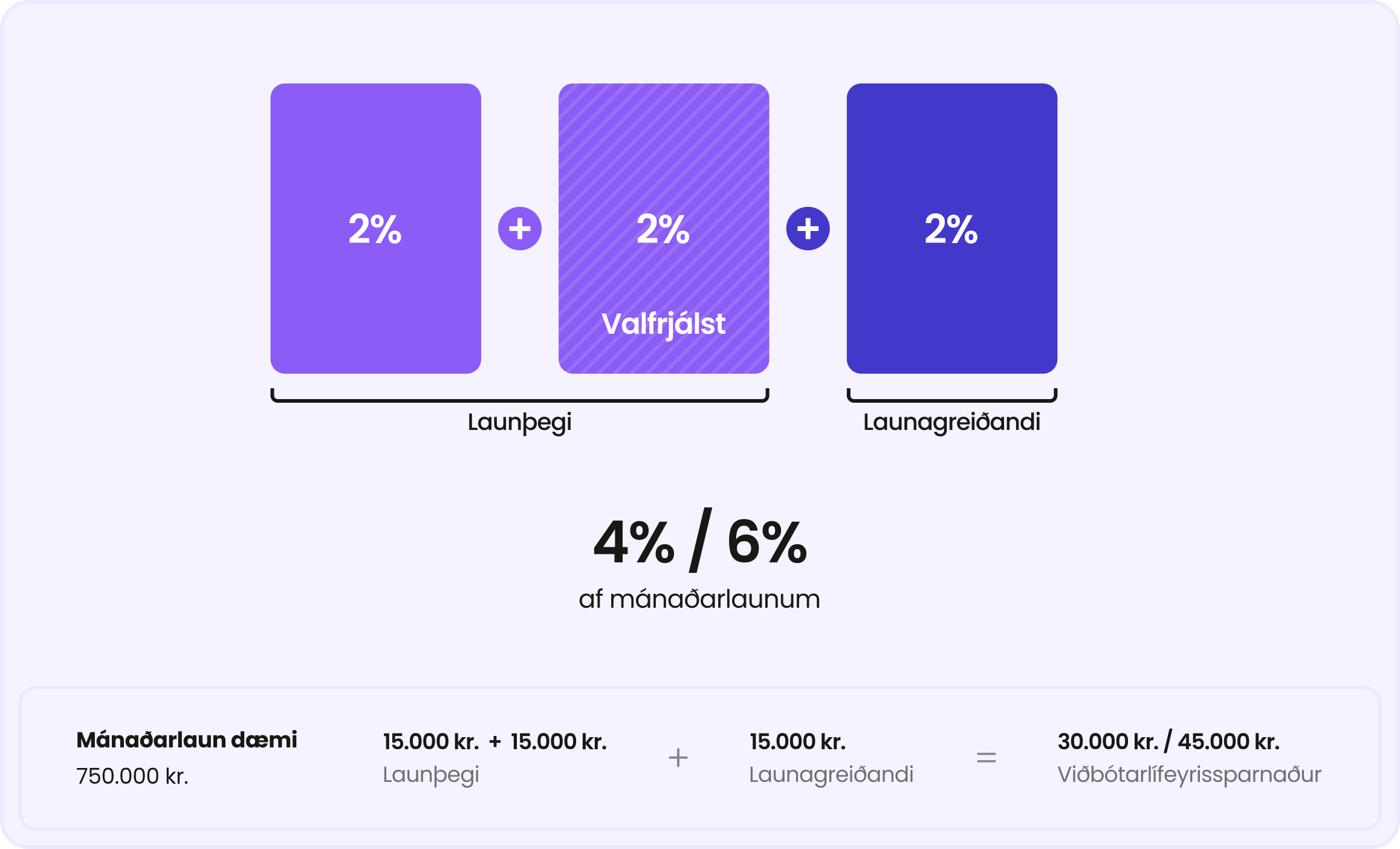 Þetta er algjörlega valfrjáls viðbót við 15,5% skylduiðgjaldið. Þú getur greitt 2–4% af launum í viðbótarlífeyrissparnað og vinnuveitandi leggur þá 2% á móti. Þetta er því í raun aukin launagreiðsla sem rennur í sparnað sem þú átt alfarið sjálfur. Sparnaðurinn ávaxtast, erfist og er hægt að taka út frá 60 ára aldri. Viðbótarlífeyrissparnaðinn má einnig nýta skattfrjálst til fyrstu fasteignakaupa eða til að lækka húsnæðislán. Hámarksnýting er 500.000 kr. á ári fyrir einstakling og 750.000 kr. fyrir hjón eða sambúðarfólk – í allt að 10 ár samfellt.