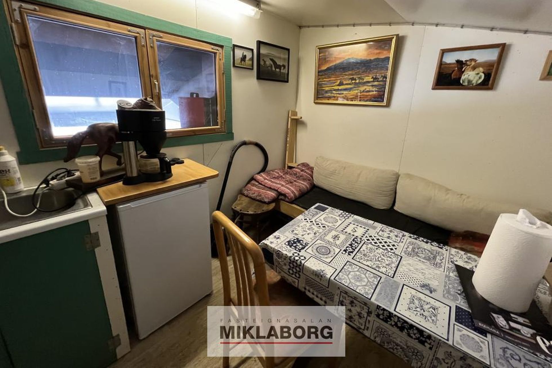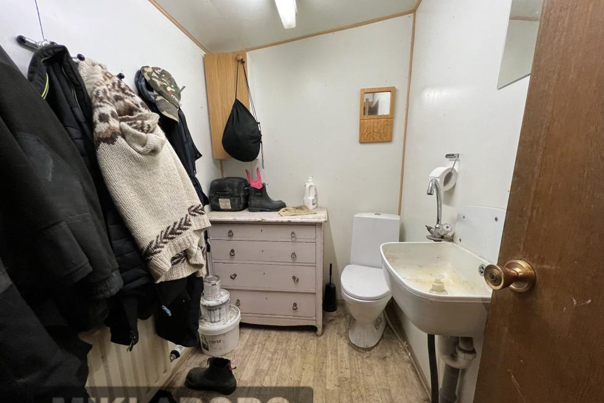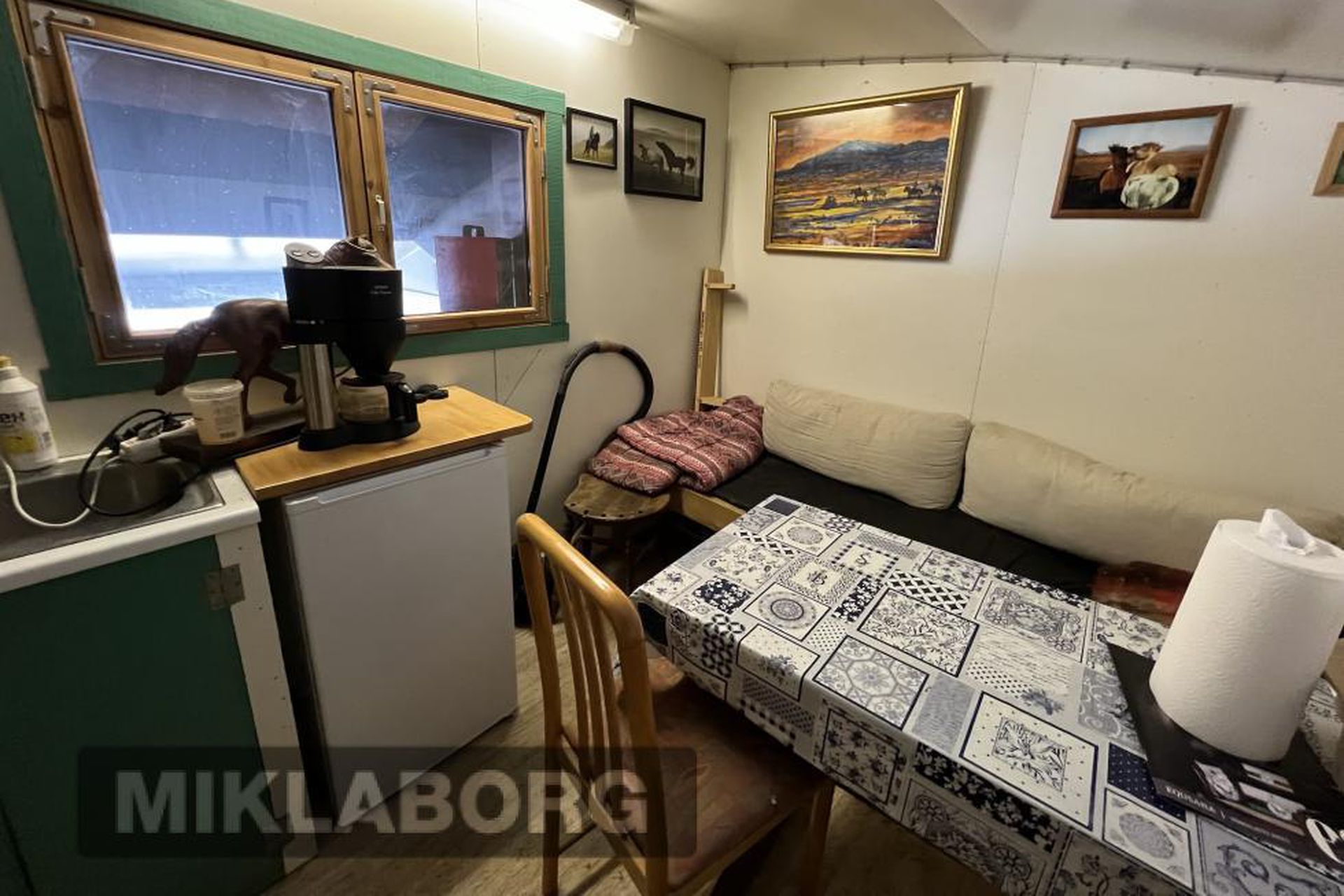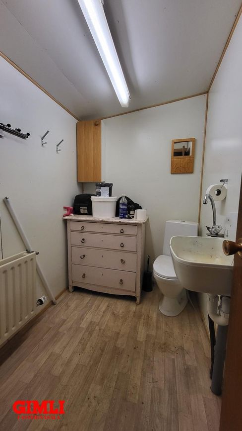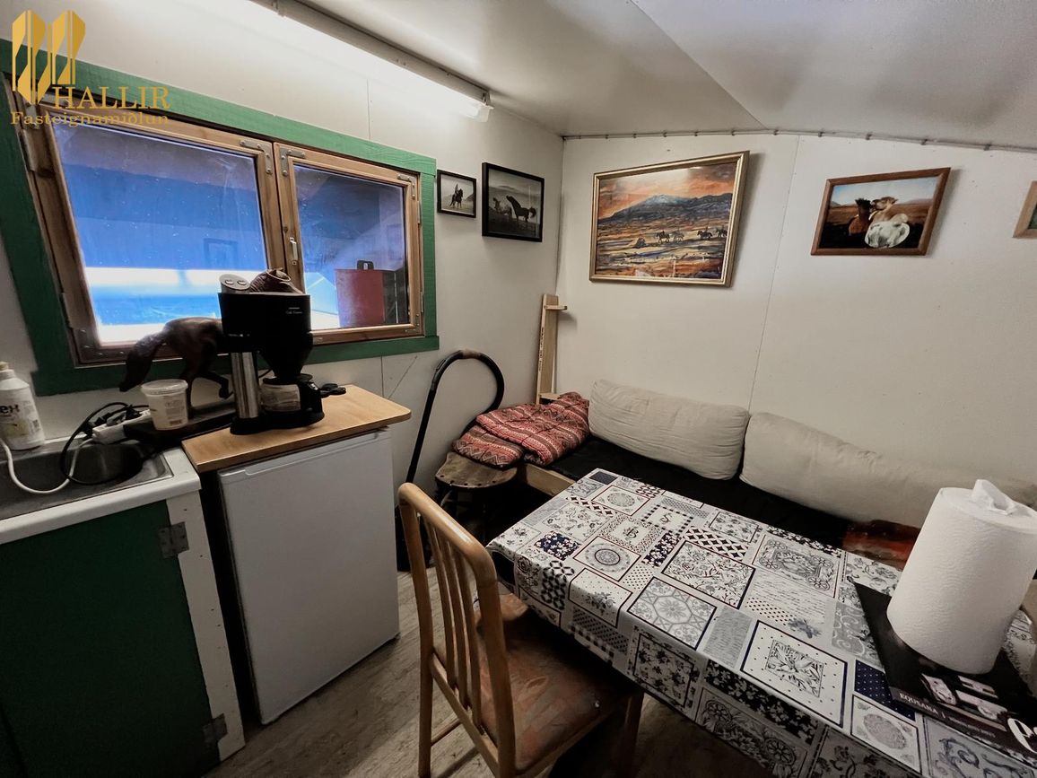 Snyrting, hnakkageymsla og plássgóð kaffistofa á efti hæð.