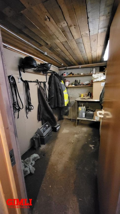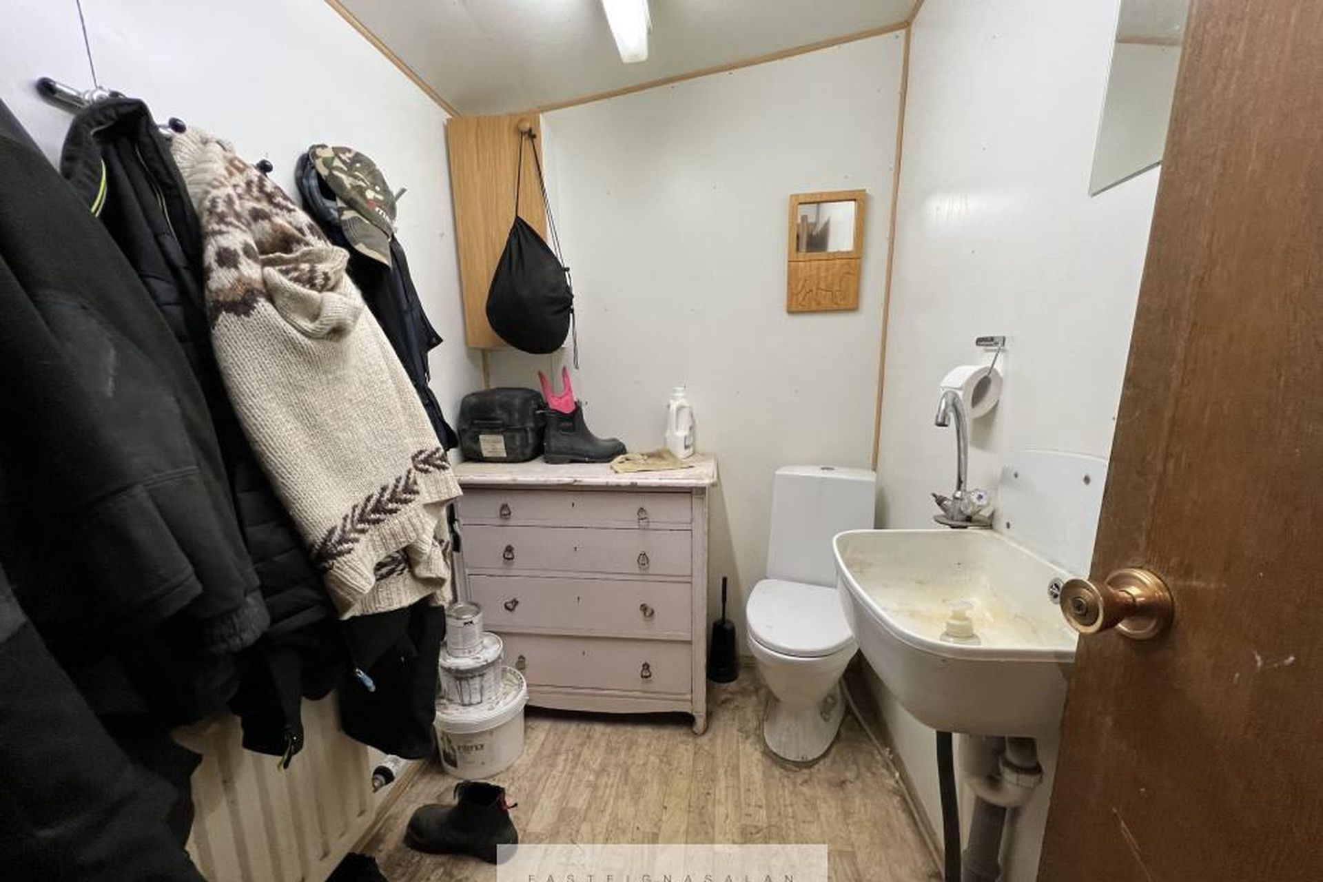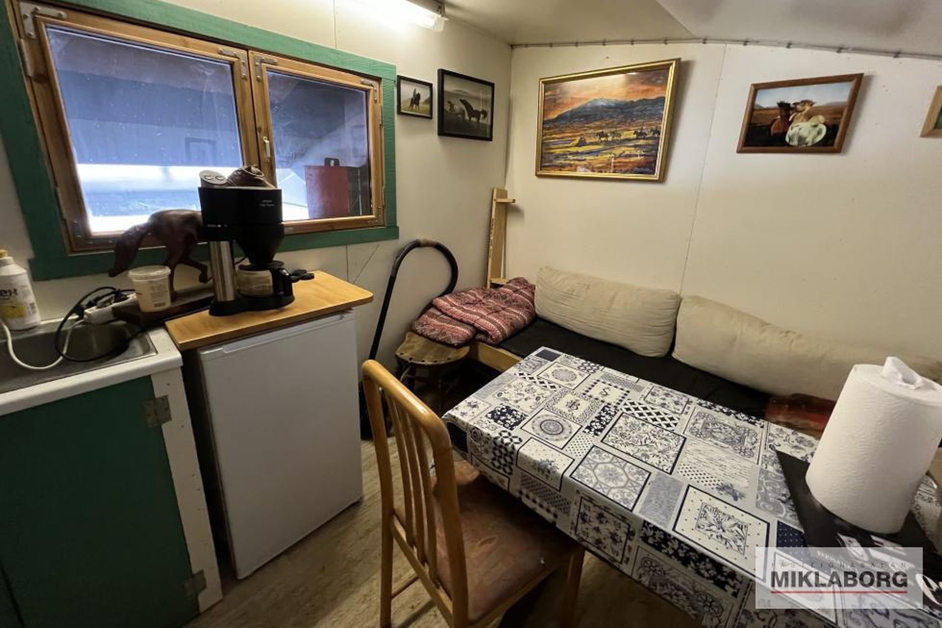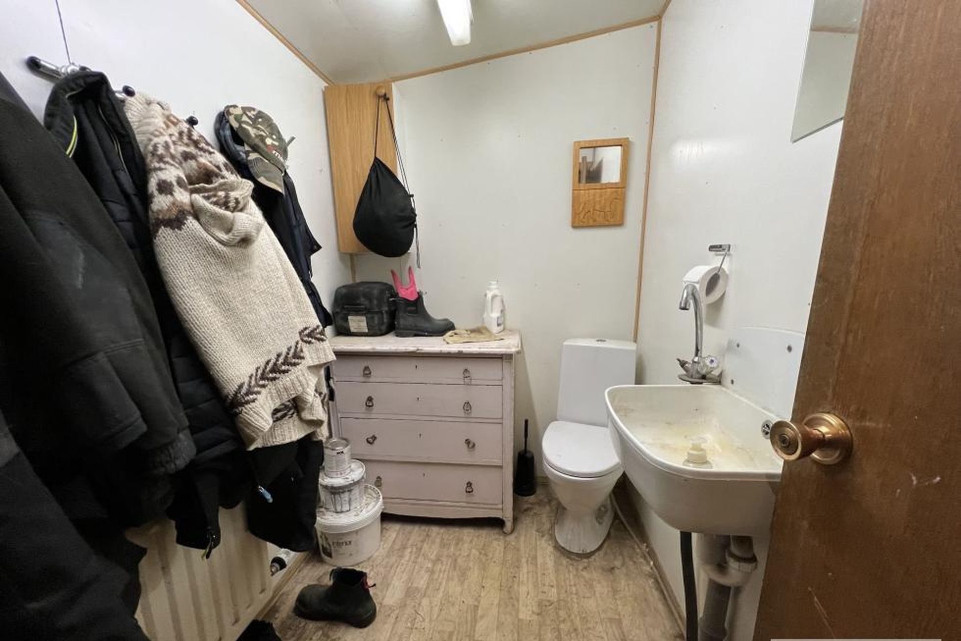 Snyrting, hnakkageymsla og plássgóð kaffistofa á efti hæð.