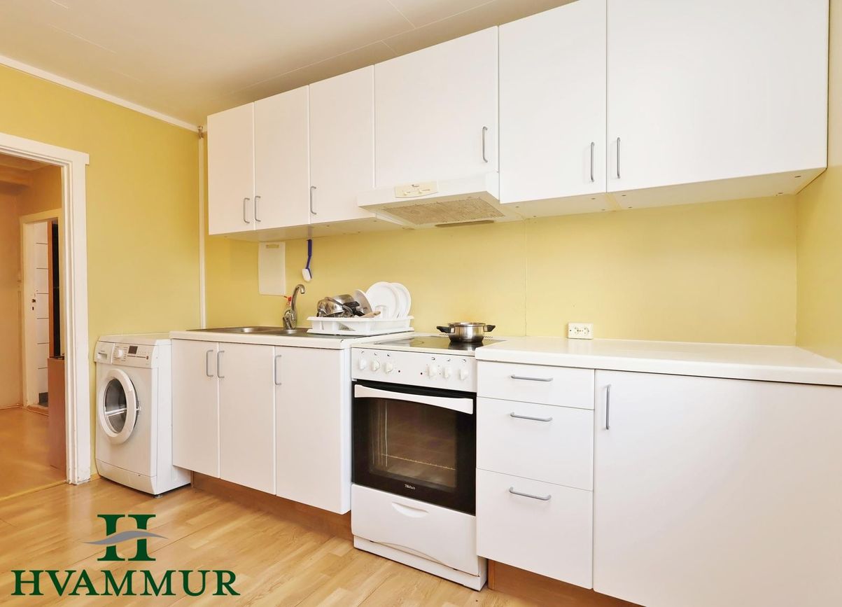 eldhúsi er ljós innrétting, neðri og efri skápar með ofni, helluborði og viftu. Þar er einnig tengi fyrir þvottavél.