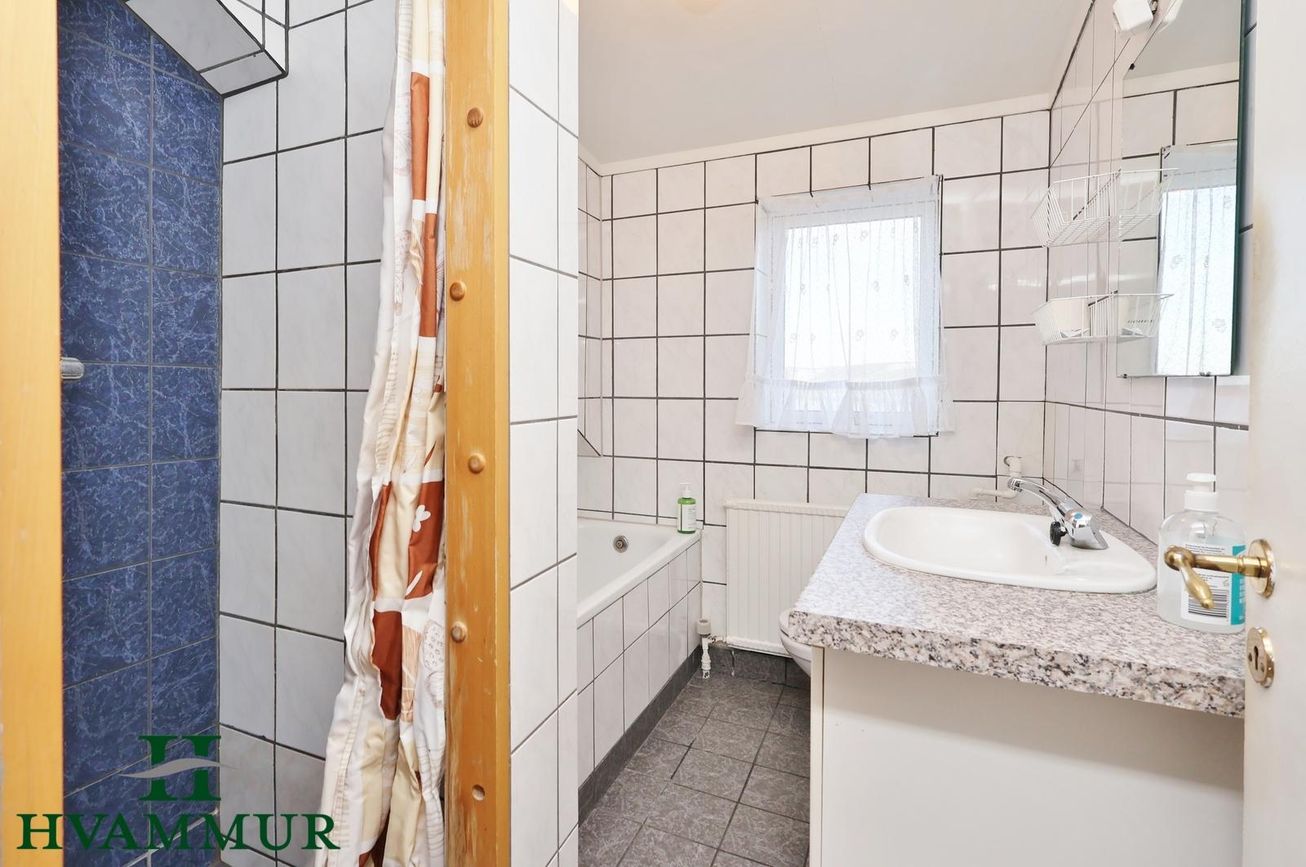 Baðherbergi er flísalagt í hólf og gólf, með sturtu, baðkari og ljósum neðri skápum með bekkplötu.