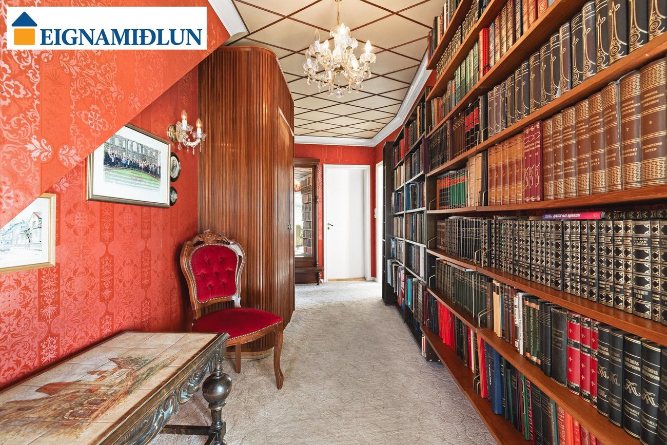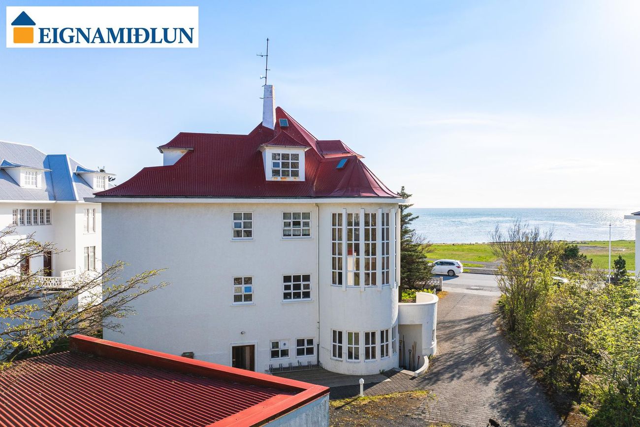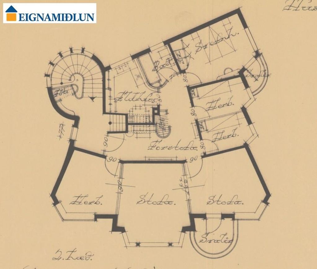 NÁNARI UPPL. VEITA: Magnea S. Sverrisdóttir lg. fasteignasali s. 861-8511, magnea@eignamidlun.is og Sverrir Kristinsson lg. fasteignasali.Nánari lýsing:Efri hæð: Þegar komið er inn í anddyri, blasa við háir gluggar og hringlaga teppalagður stigi. Stigaholið er rúmgott og bjart, þar eru mjög háir gluggar sem sem setja einstaklega fallegan svip á rýmið. Frá stigapalli er gengið inn í íbúðina.