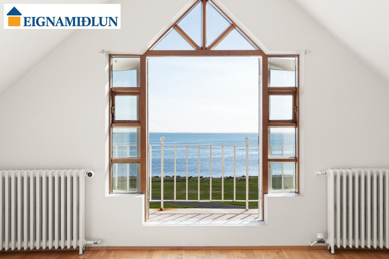 Stofa: Komið er inn í parketlagða stofu með stórum kvisti. Svalir eru út af stofu, með tvöfaldri hurð. Stórglæsilegt útsýni.