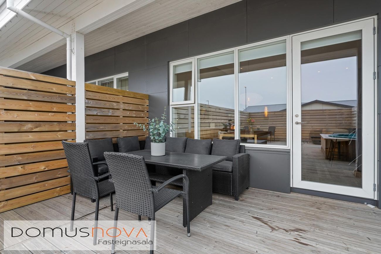 STÓR SUÐURSÓLPALLUR MEÐ HEITUM POTTI OG SKJÓLGIRÐINGU.INNKEYRSLA RÚMAR TVO BÍLA, HLEÐSLUSTÖÐ Í BÍLSKÚR.Raðhúsið er 183,6 fm sem skiptist í 152,7 fm íbúð og 30,9 fm bílskúr.