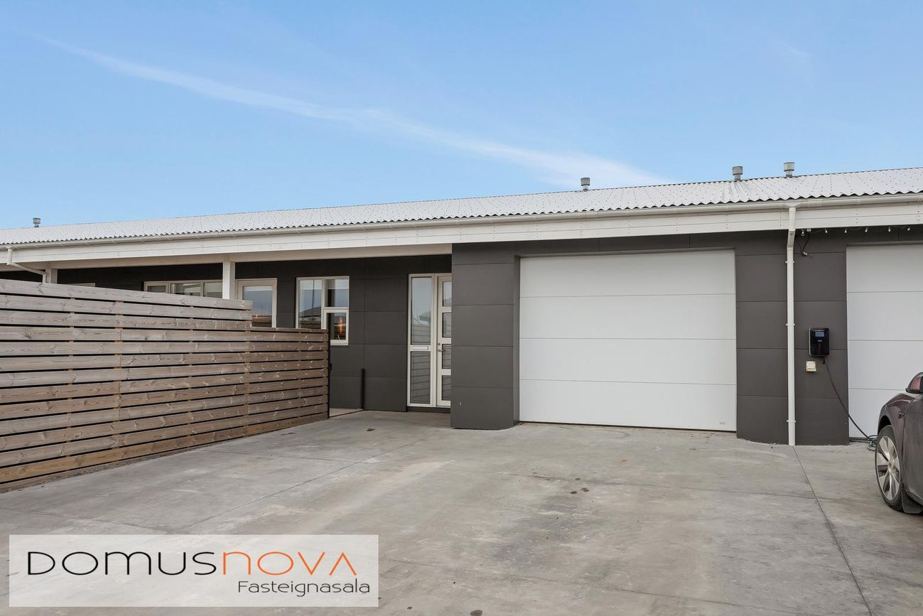 - Gluggar, hurðir og gler: Bílskúrshurð er stálfellihurð. Hurðir og gluggar eru álklæddir timburgluggar.