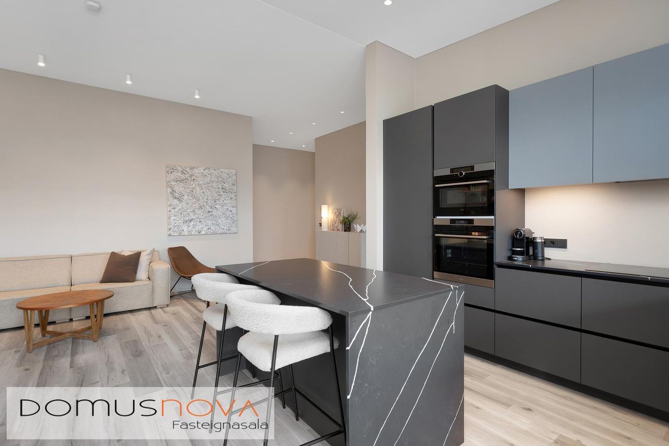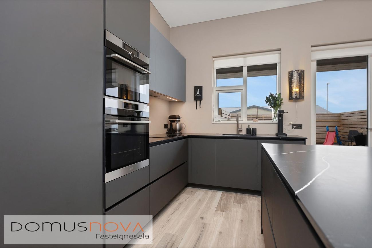 Eldhús, með fallegri innréttingu frá VOKE og eyju. Quarts steinn fra VOKE á innréttingu. Span helluborð og tveir ofnar frá AEG, annar ofninn sambyggður með ofni og örbylgju. Innfelld uppþvottavél frá AEG og innfelldur ísskápur einnig frá AEG.