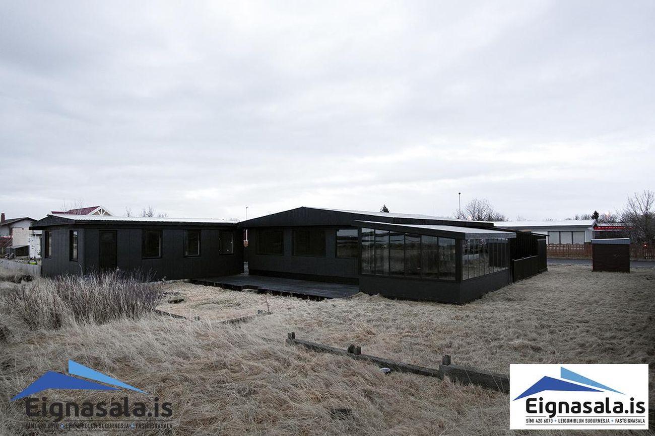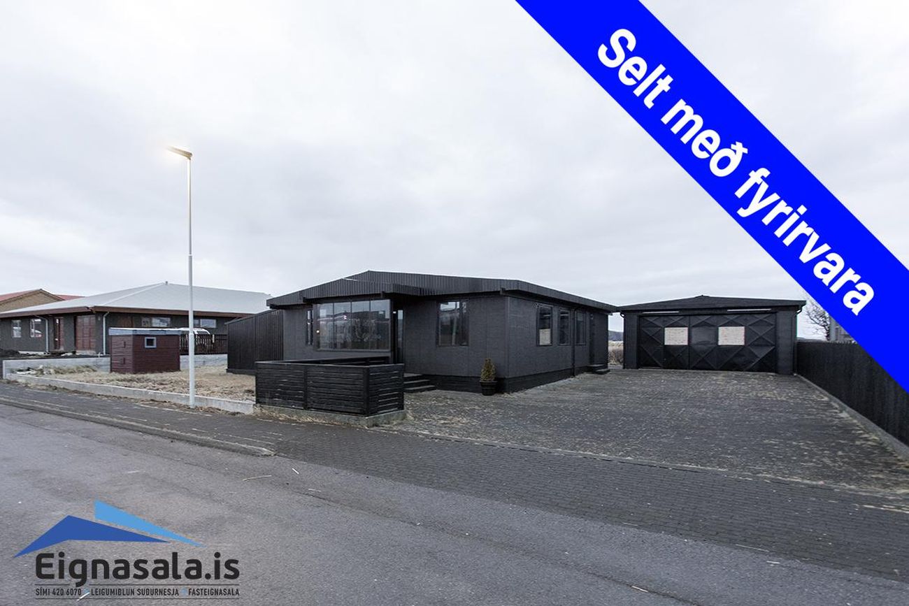 5 herbergja einbýlishús ( 3 svefnherbergi og 2 stofur) á einni hæð með bílskúr og tveimur sólpöllum á lóð.