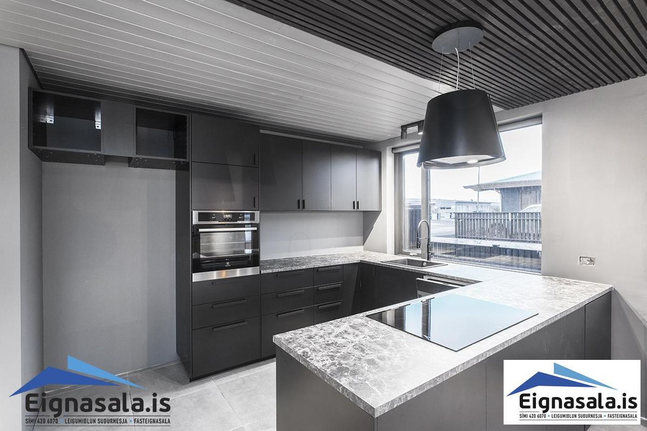 Eldhús með nýjum svörtum viðarinnréttingum,ný eldhústæki, plastlagðar borðplötur. Flísar á gólfum.