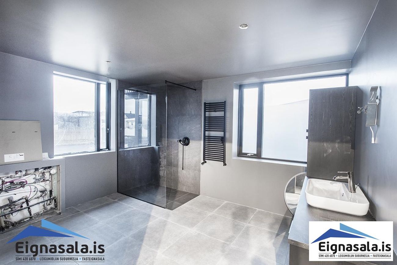 Baðherbergi með nýjum flísum á gólfi, með flísalögðum sturtubotni og nýrri innréttingu. Vegghengt salerni og handklæðaofn.