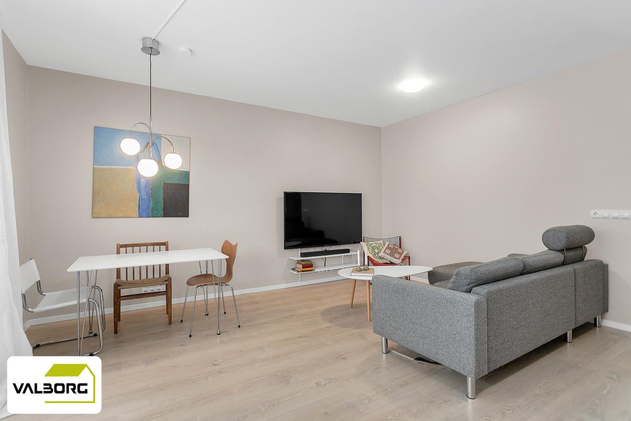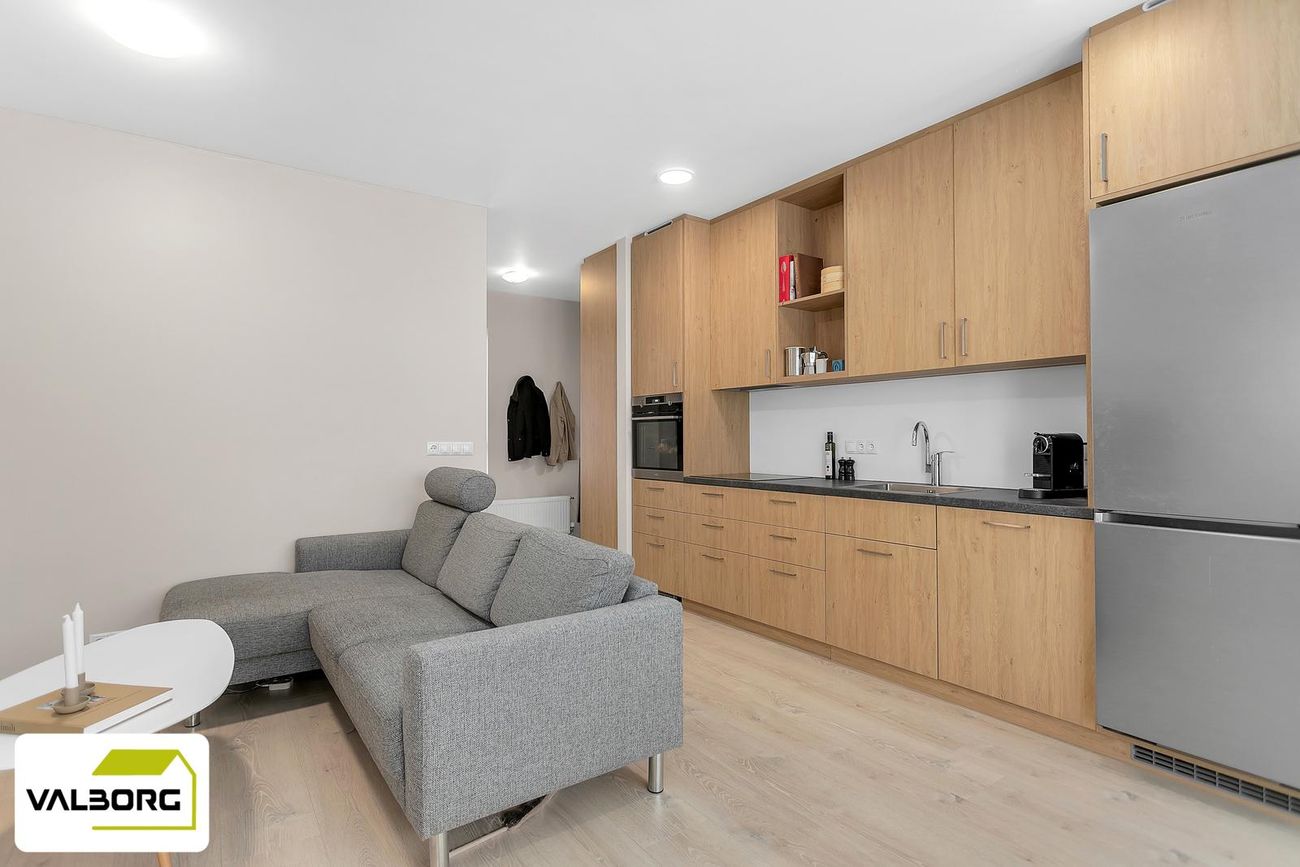 Eldhús er með sérsmíðaðri innréttingu. Spanhelluborð, vifta og bakarofn í vinnuhæð frá AEG. Gert er ráð fyrir einföldum ísskáp í innréttingu, innbyggð uppþvottavél.