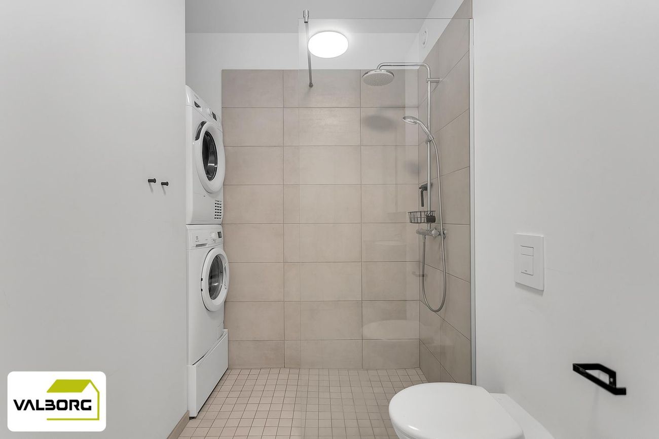 Baðherbergi er flísalagt. Sturta er flísalögð, vegghengt salerni, vaskaskápur og speglaskápur. Á baðherberginu er gert ráð fyrir þvottavél og þurkara. Gólfhiti er á baðherbergi.