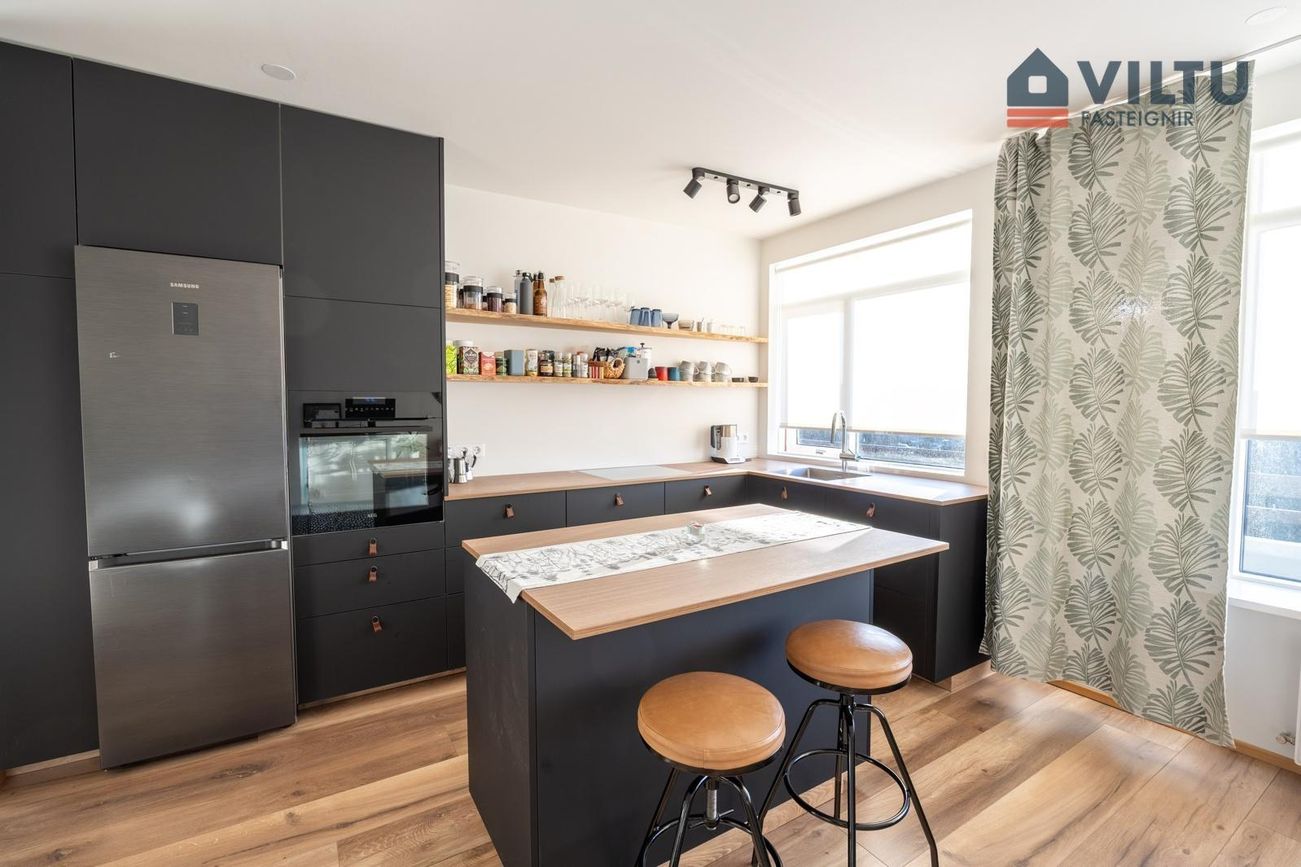 Eldhús: Opið inn í stofu. Falleg svört innrétting með ofni í vinnuhæð, eyju og góðu skápaplássi. Parket á gólfi.