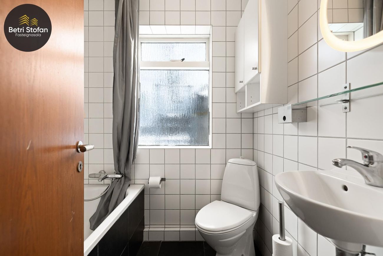 Baðherbergi: Flísalagt í hólf og gólf með upphengdum vaski og spegli fyrir ofan vask. Upphengdur skápur. Baðkar með sturtuaðstöðu. Gluggi með opnanlegu fagi.