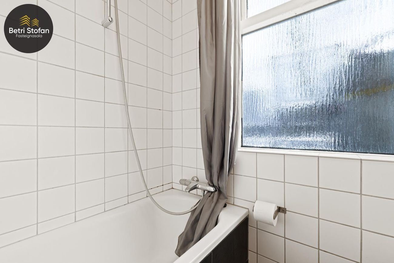 Baðherbergi: Flísalagt í hólf og gólf með upphengdum vaski og spegli fyrir ofan vask. Upphengdur skápur. Baðkar með sturtuaðstöðu. Gluggi með opnanlegu fagi.