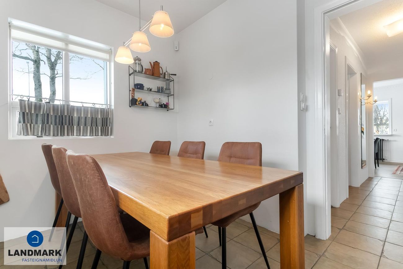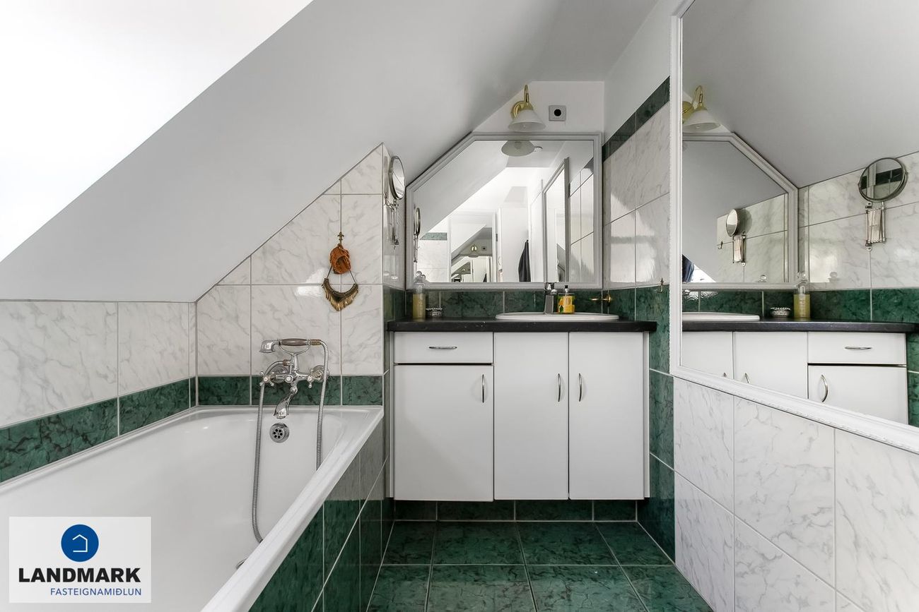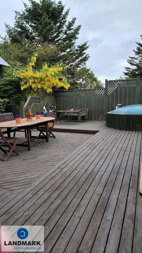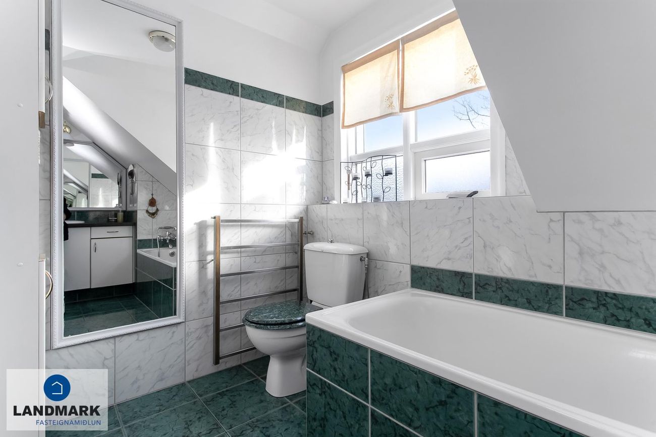 samtals: 222,4 fm. Þess ber að geta að efri hæðin er undir súð og því er gólfflöturinn stærri en skráðir fm. Gólfhiti er í holi og í eldhúsi annars er ofnakerfi í húsinu. Húsið hefur fengið mjög gott viðhald í gegnum tíðina, fallegur timburpallur bakatil með heitum potti. Nýbúið var að endurnýja þakið að sunnanverðu þegar seljendur keyptu eignina og þau létu endurnýja þakið að norðanverður fyrir um tveimur árum síðan. Nýtt þak sett á bílskúr í kringum 2010 – lofthæð hækkuð um ca. 1,5 m. Mjög stórt bílaplan með hita - fimm svefnherbergi eru í húsinu.