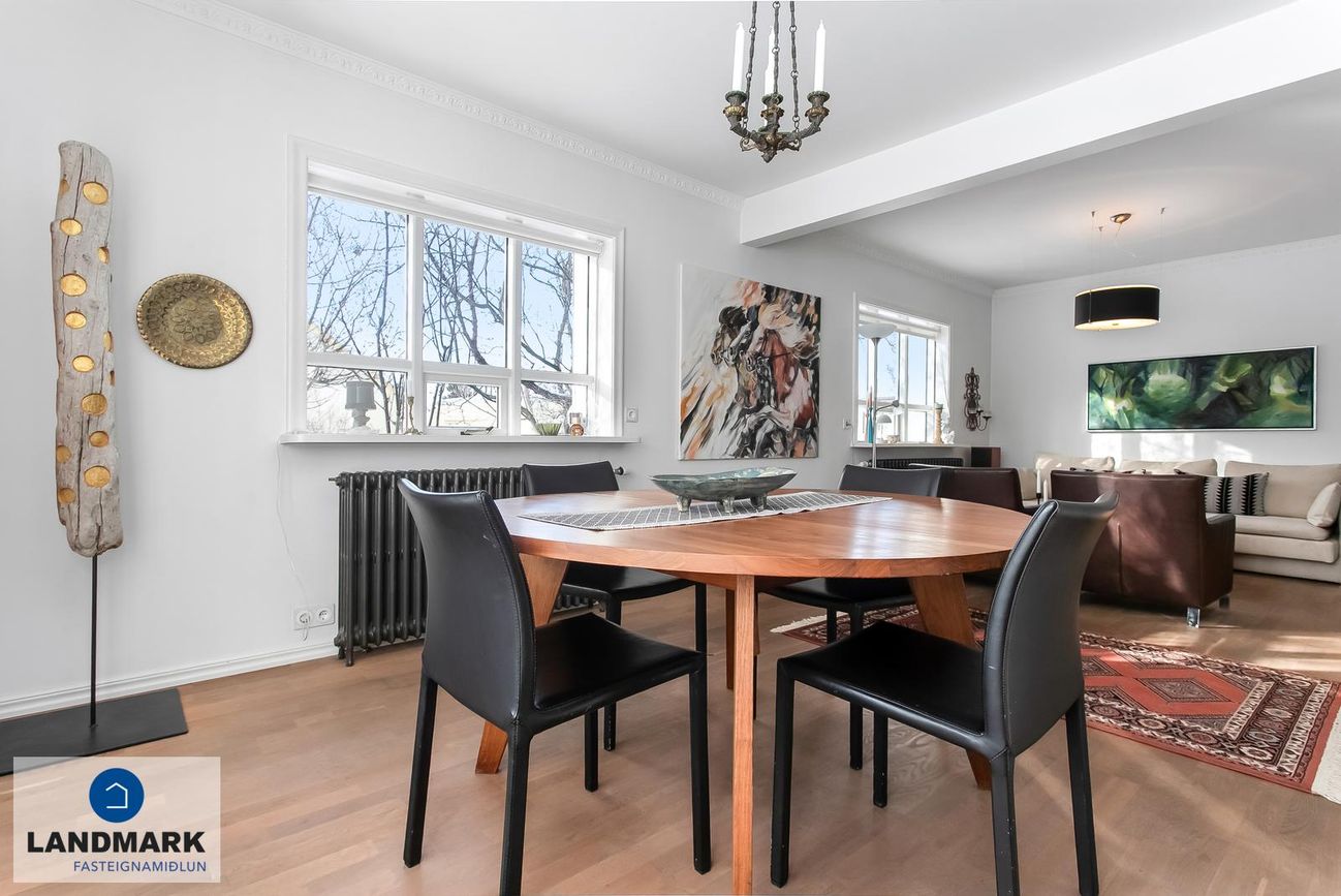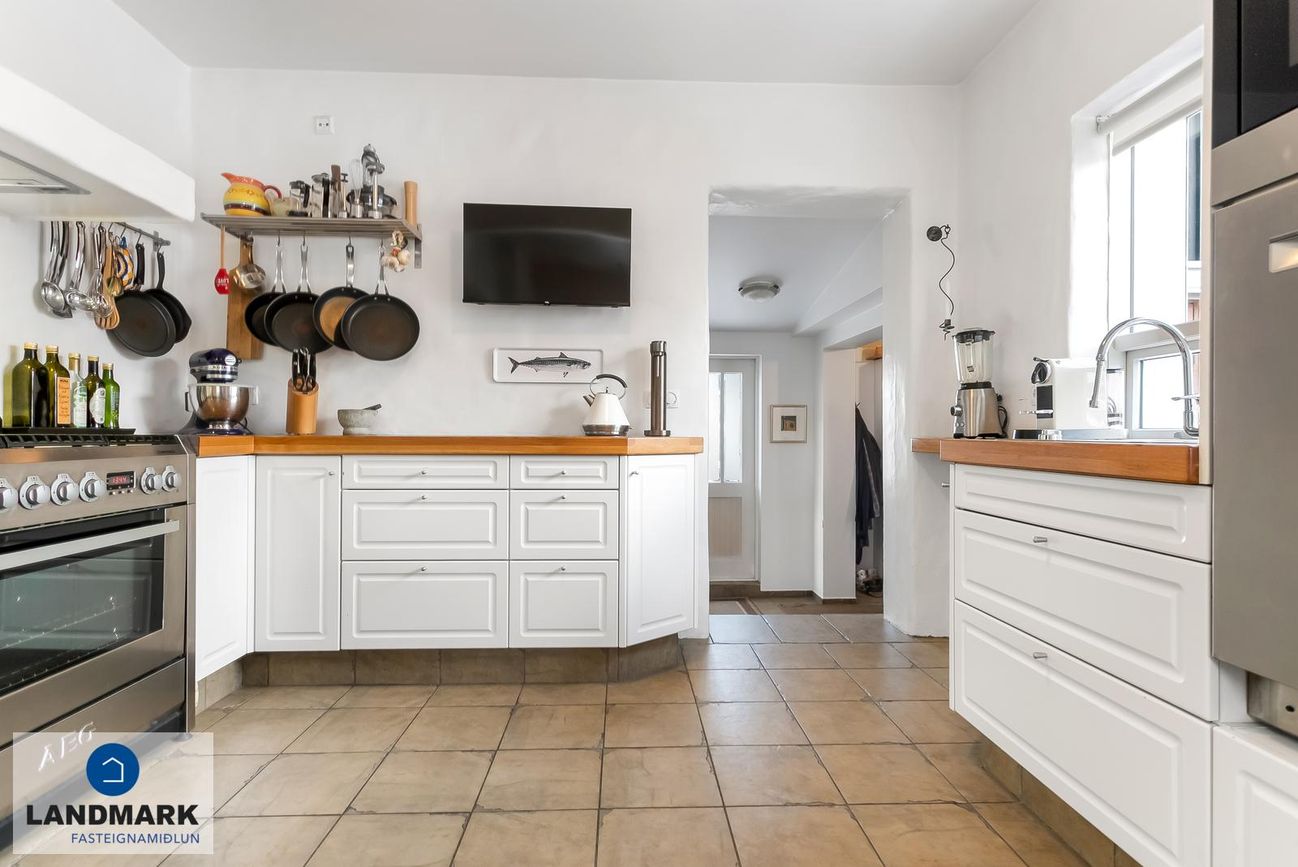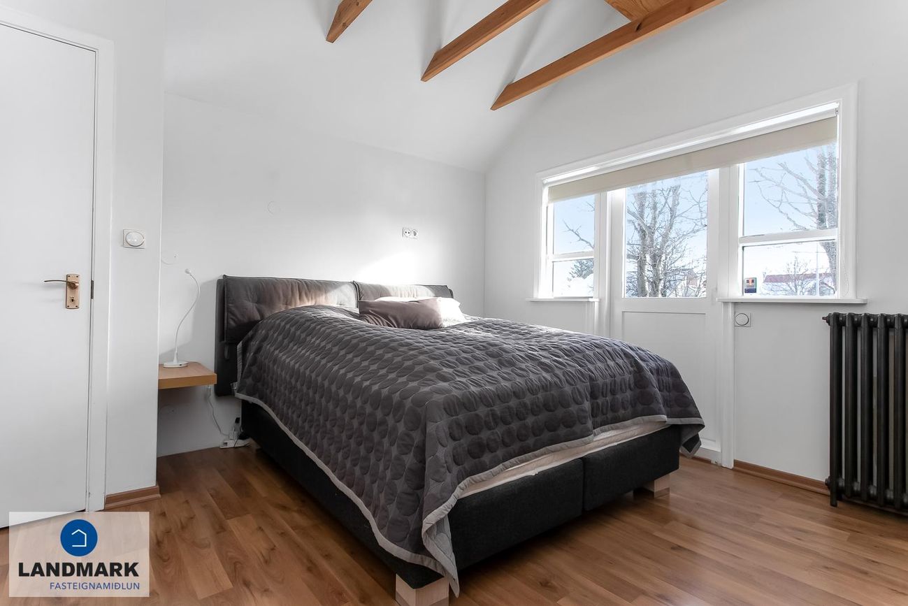samtals: 222,4 fm. Þess ber að geta að efri hæðin er undir súð og því er gólfflöturinn stærri en skráðir fm. Gólfhiti er í holi og í eldhúsi annars er ofnakerfi í húsinu. Húsið hefur fengið mjög gott viðhald í gegnum tíðina, fallegur timburpallur bakatil með heitum potti. Nýbúið var að endurnýja þakið að sunnanverðu þegar seljendur keyptu eignina og þau létu endurnýja þakið að norðanverður fyrir um tveimur árum síðan. Nýtt þak sett á bílskúr í kringum 2010 – lofthæð hækkuð um ca. 1,5 m. Mjög stórt bílaplan með hita - fimm svefnherbergi eru í húsinu.