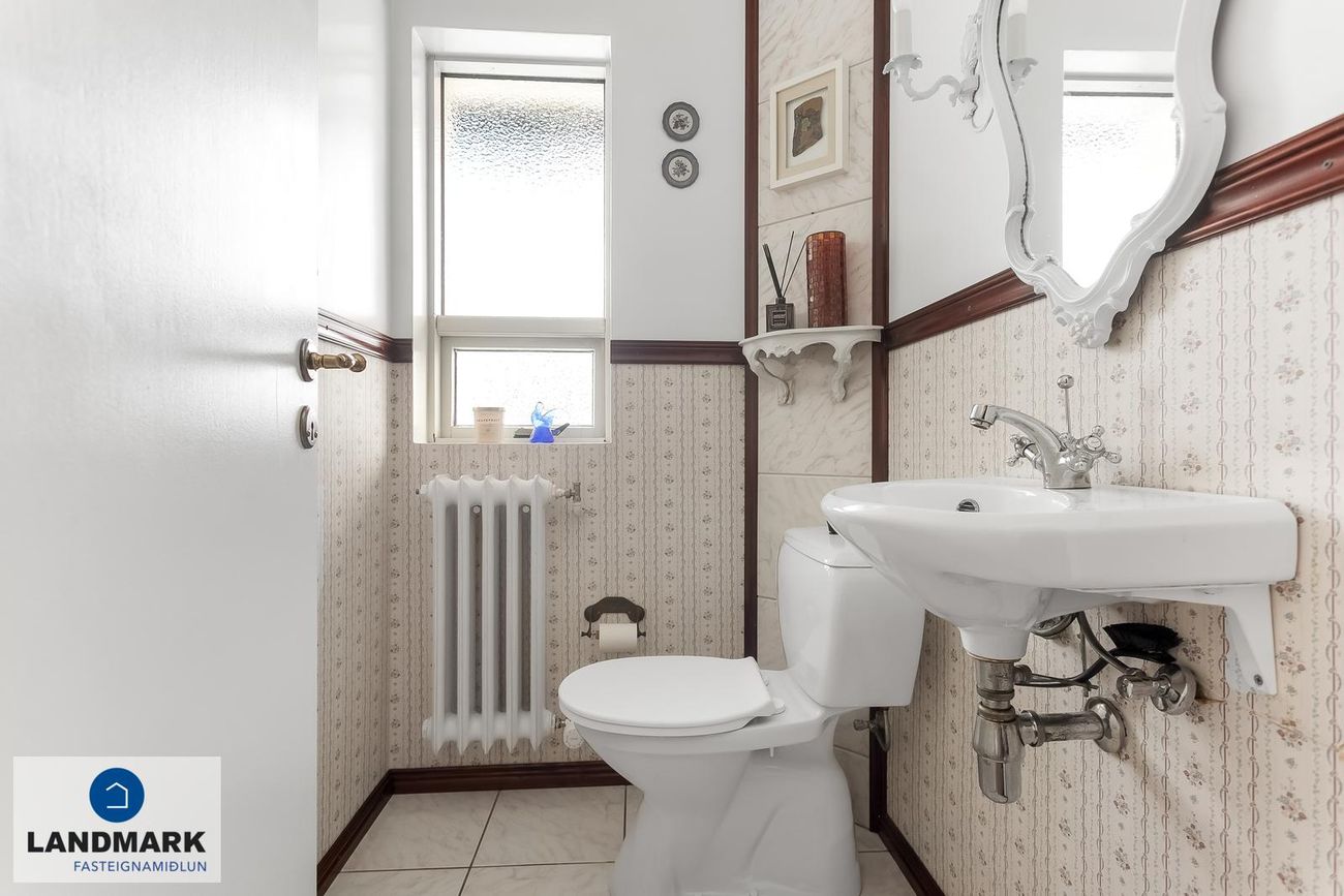 Snyrtig á neðri hæðinni með glugga. Á vinstri hönd er