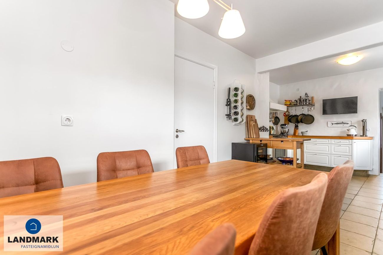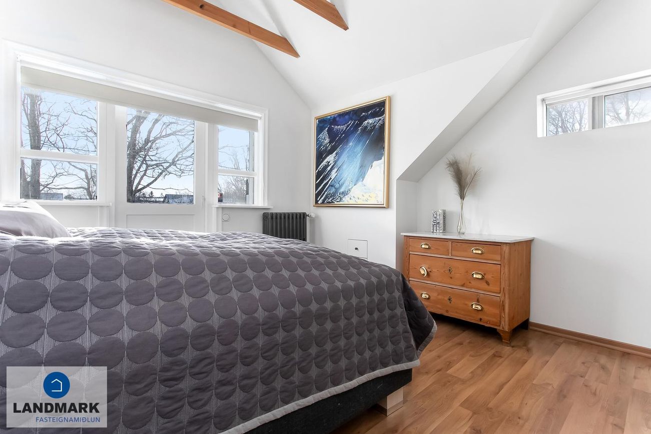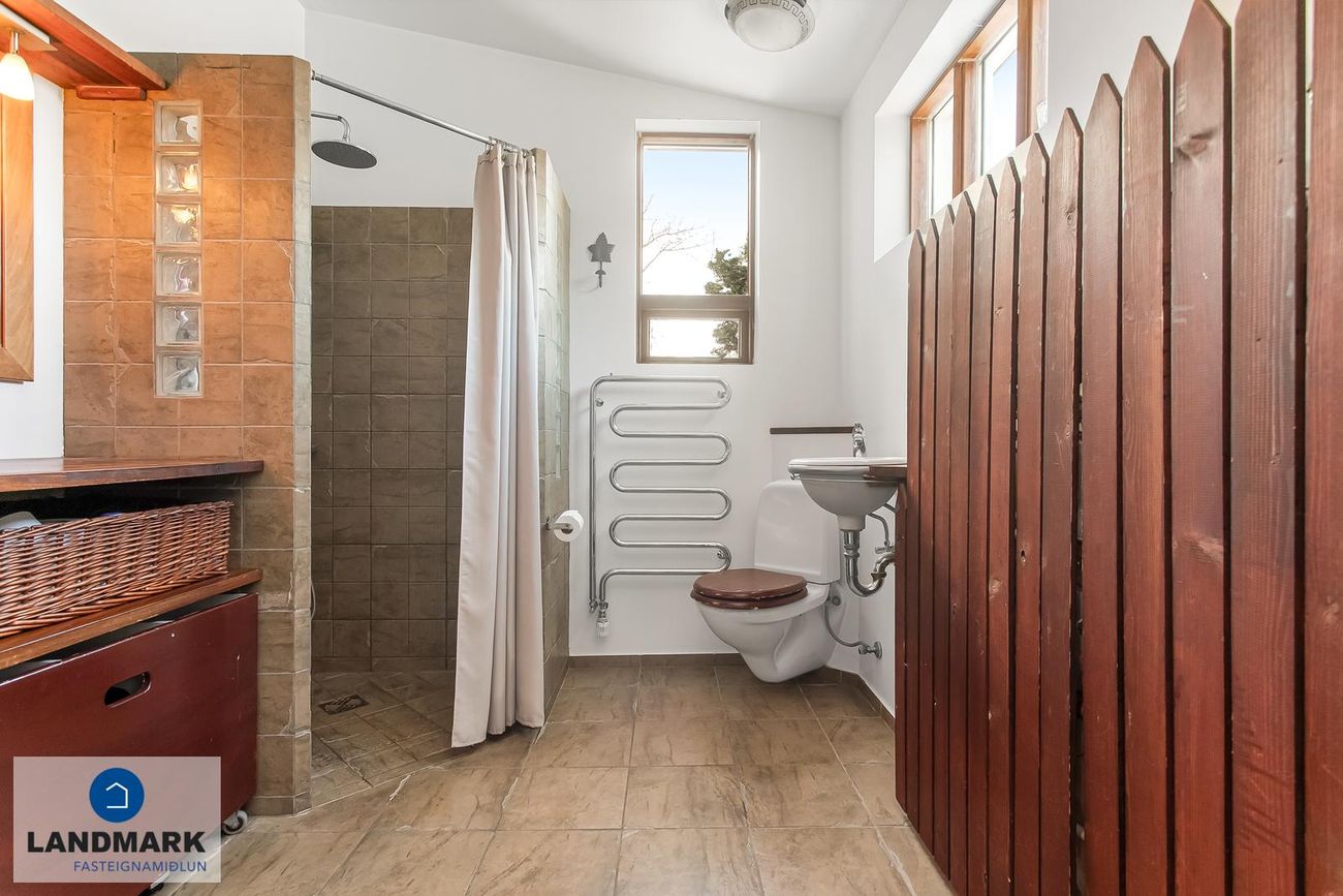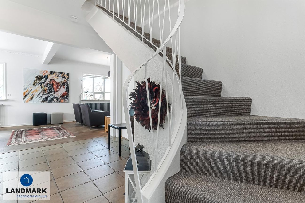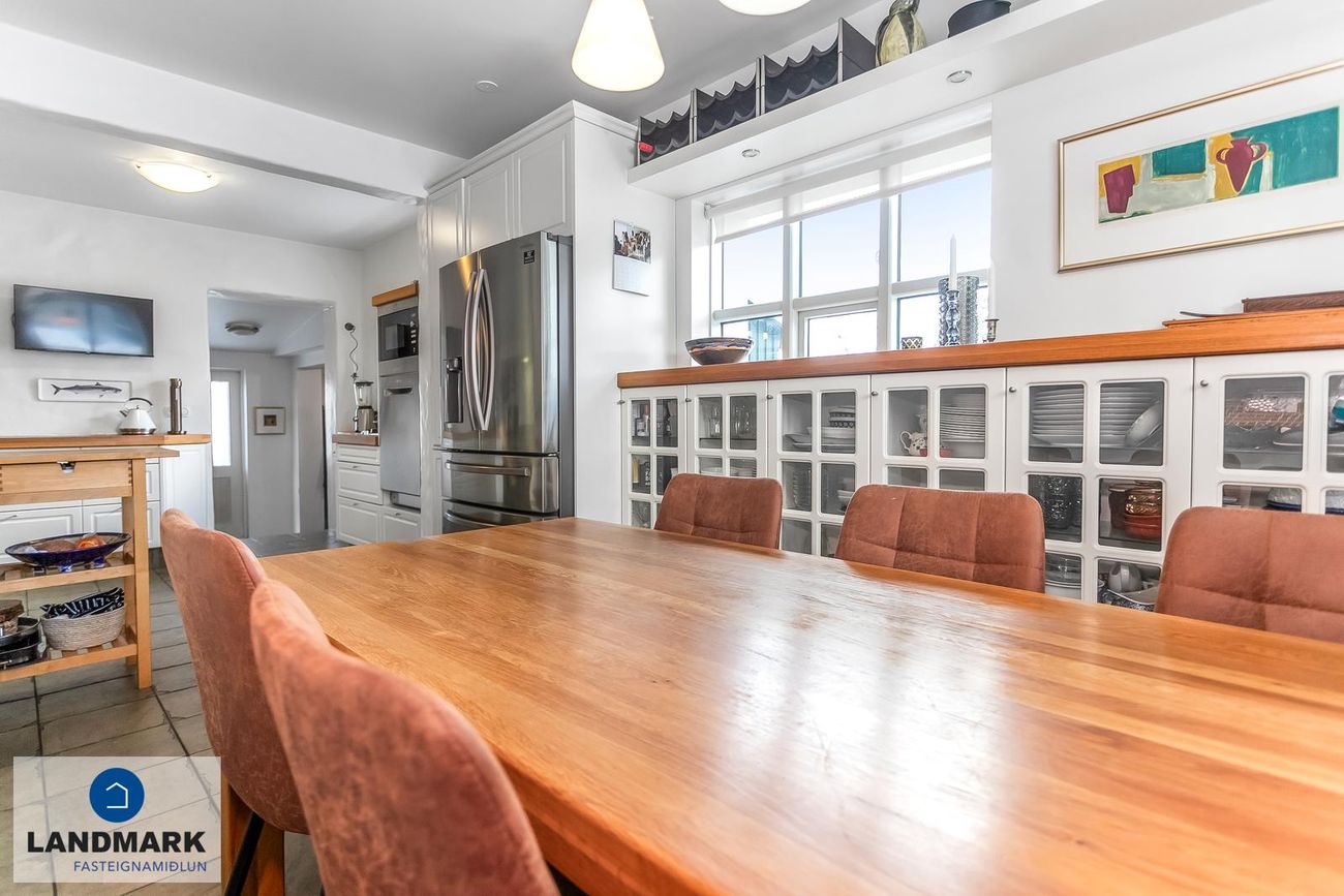 samtals: 222,4 fm. Þess ber að geta að efri hæðin er undir súð og því er gólfflöturinn stærri en skráðir fm. Gólfhiti er í holi og í eldhúsi annars er ofnakerfi í húsinu. Húsið hefur fengið mjög gott viðhald í gegnum tíðina, fallegur timburpallur bakatil með heitum potti. Nýbúið var að endurnýja þakið að sunnanverðu þegar seljendur keyptu eignina og þau létu endurnýja þakið að norðanverður fyrir um tveimur árum síðan. Nýtt þak sett á bílskúr í kringum 2010 – lofthæð hækkuð um ca. 1,5 m. Mjög stórt bílaplan með hita - fimm svefnherbergi eru í húsinu.