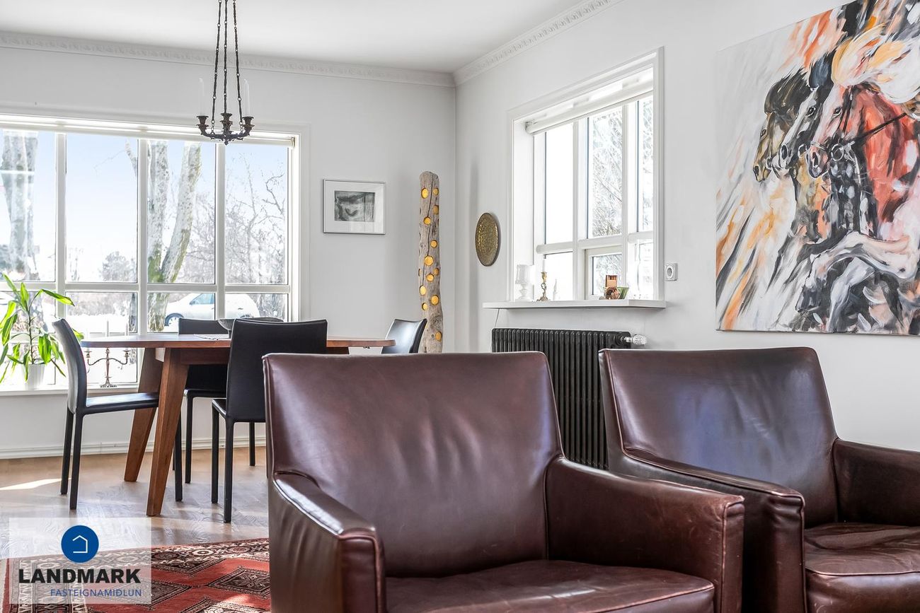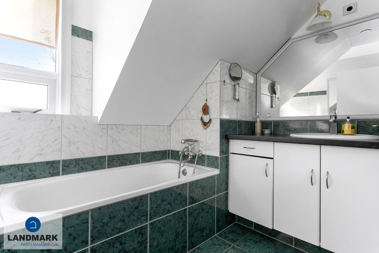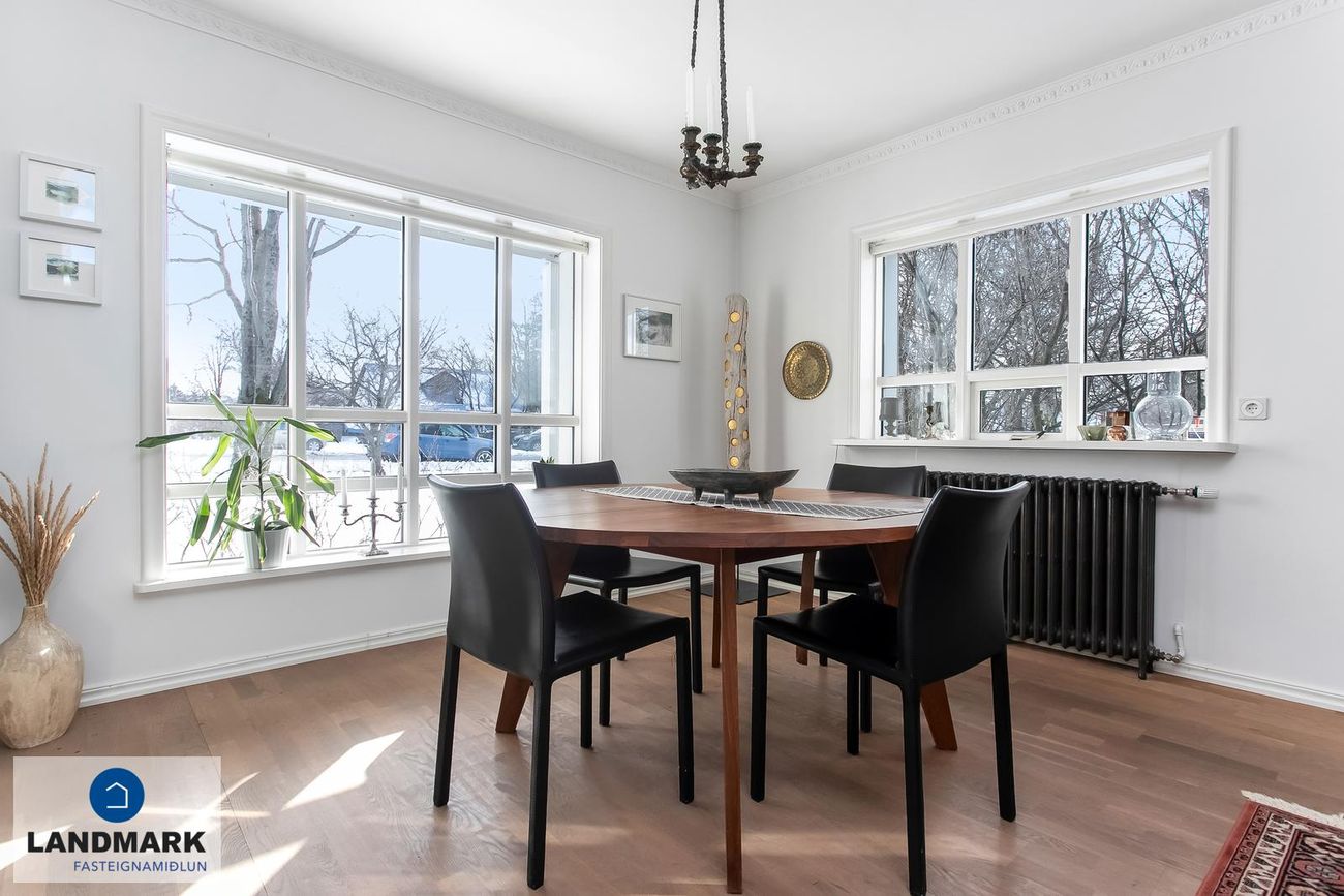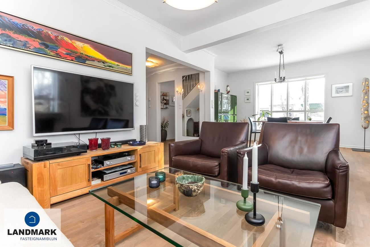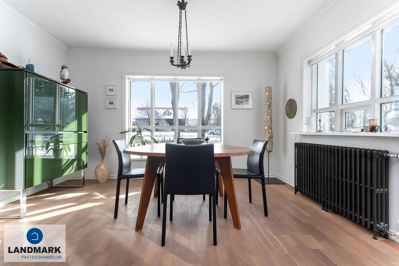 samtals: 222,4 fm. Þess ber að geta að efri hæðin er undir súð og því er gólfflöturinn stærri en skráðir fm. Gólfhiti er í holi og í eldhúsi annars er ofnakerfi í húsinu. Húsið hefur fengið mjög gott viðhald í gegnum tíðina, fallegur timburpallur bakatil með heitum potti. Nýbúið var að endurnýja þakið að sunnanverðu þegar seljendur keyptu eignina og þau létu endurnýja þakið að norðanverður fyrir um tveimur árum síðan. Nýtt þak sett á bílskúr í kringum 2010 – lofthæð hækkuð um ca. 1,5 m. Mjög stórt bílaplan með hita - fimm svefnherbergi eru í húsinu.