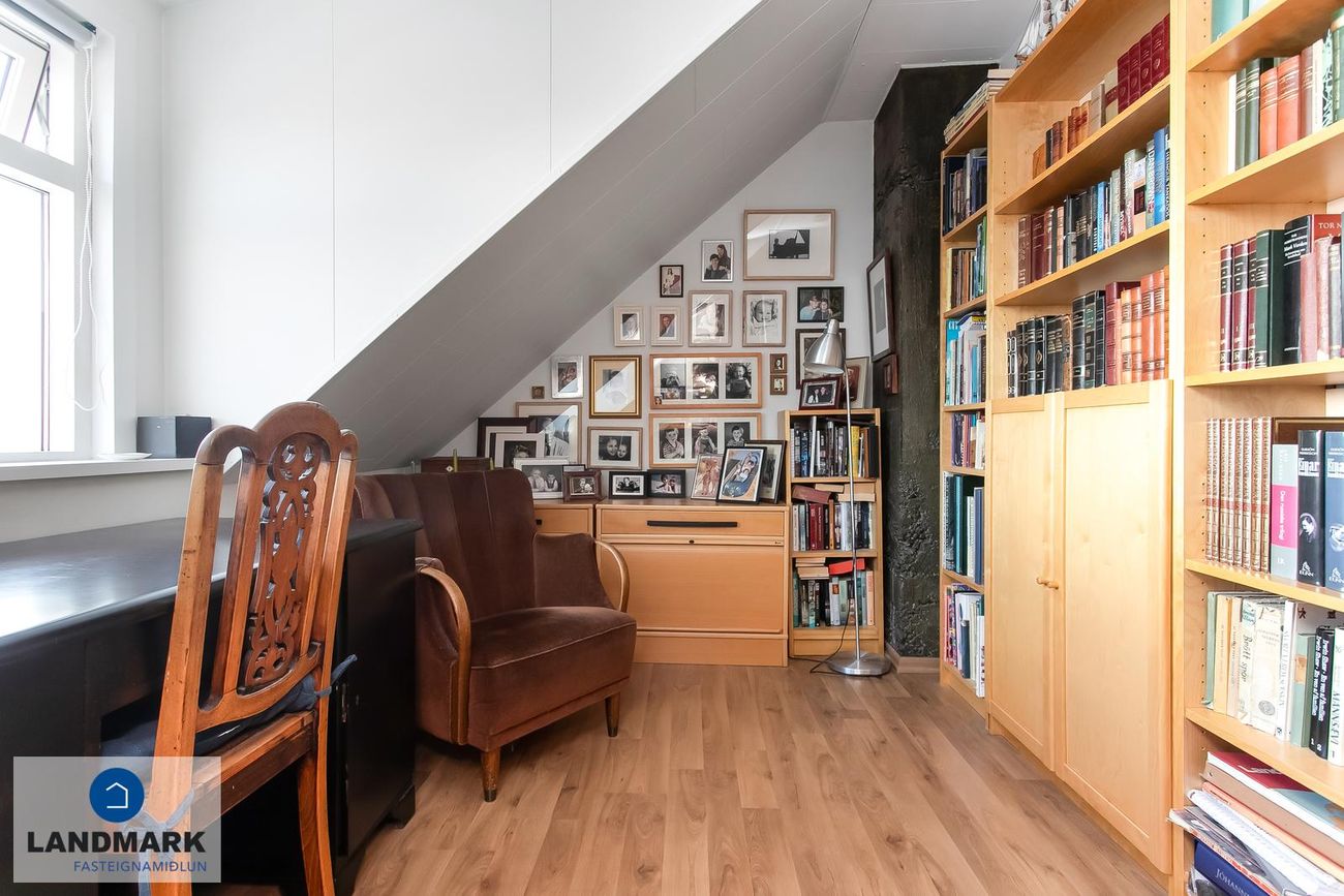 Svefnherbergi á neðri hæðinni sem er nýtt í dag sem skrifstofa.