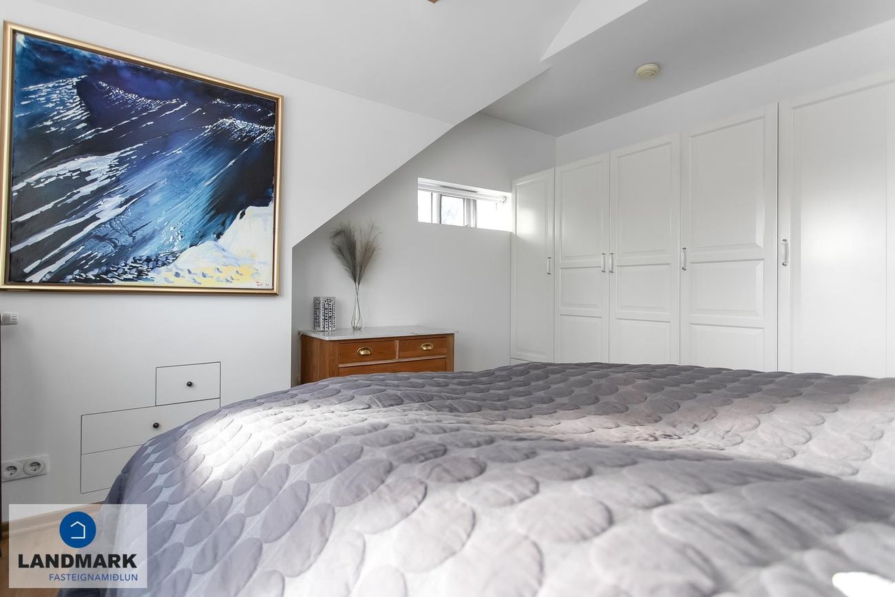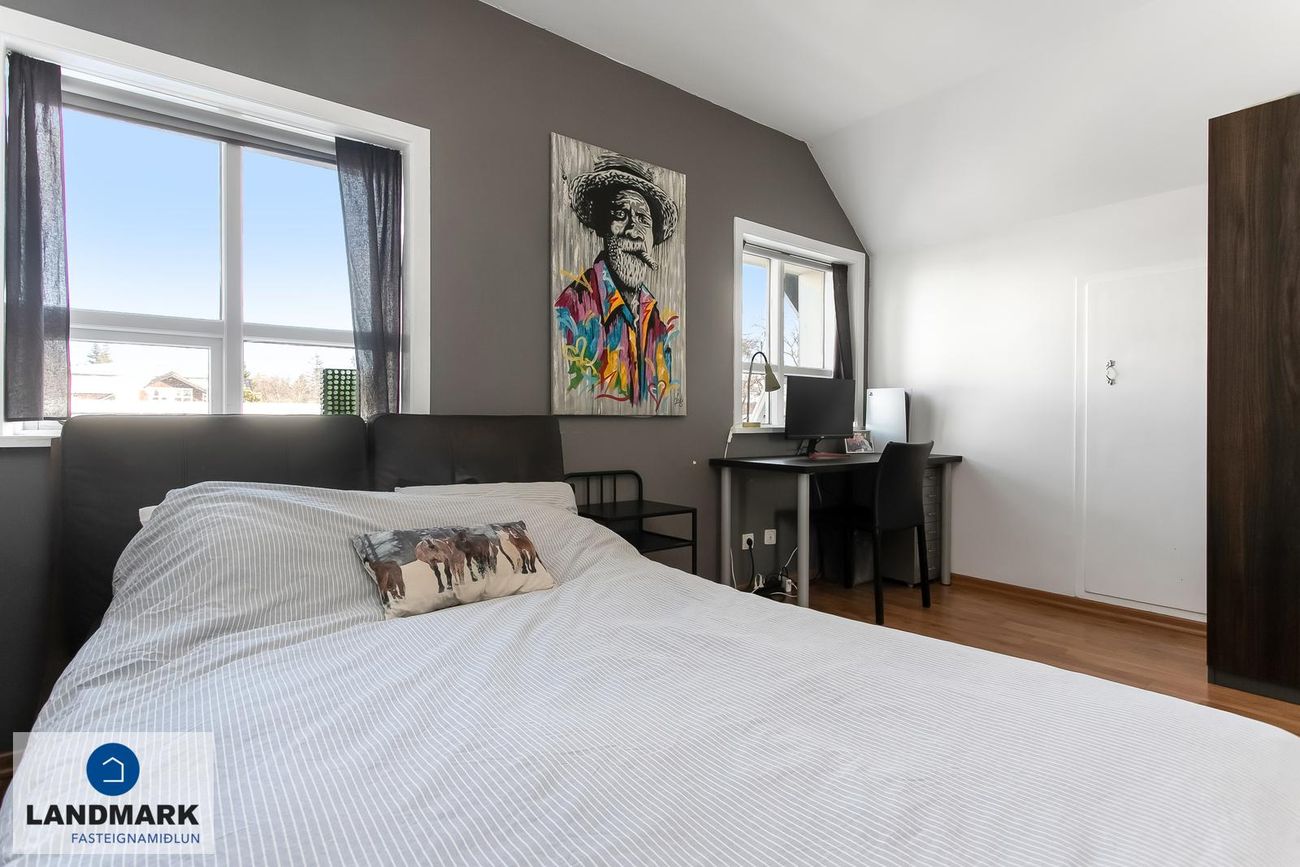 fjögur svefnherbergi og frá hjónaherbergi er gengið út á svalir.