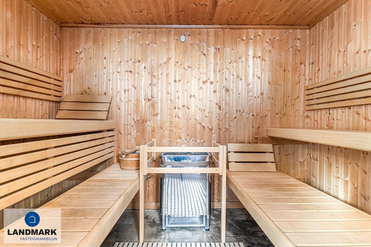 saunaherbergi þar sem unnt er að ganga út á timburpallinn. Nýr glerfrontur með tvöfaldri opnun er á bílskúr Í bílskúrnum er einnig tengi fyrir þvottavél. Frá holi / gangi neðri hæðar er gengið upp stiga upp á