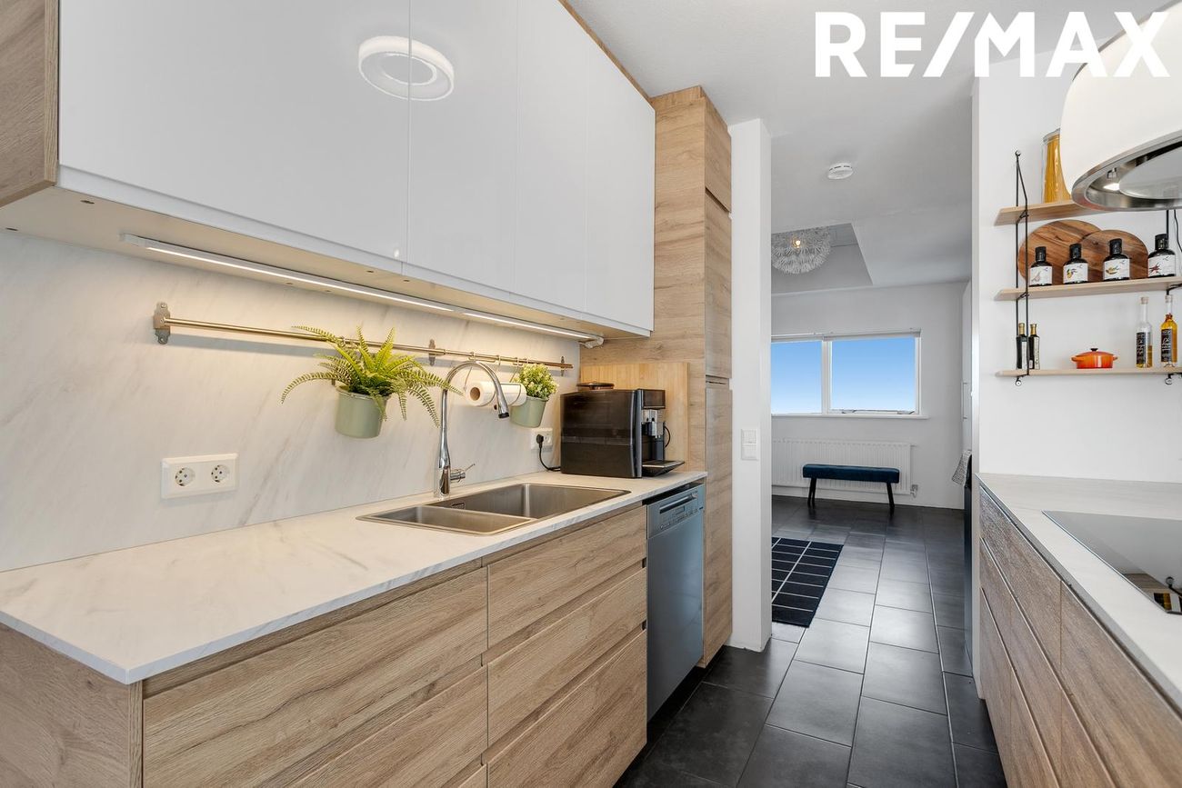 Eldhús hefur verið nýlega endurnýjað og býður upp á gott skápapláss, flísar á milli skápa og rúmgott vinnupláss.