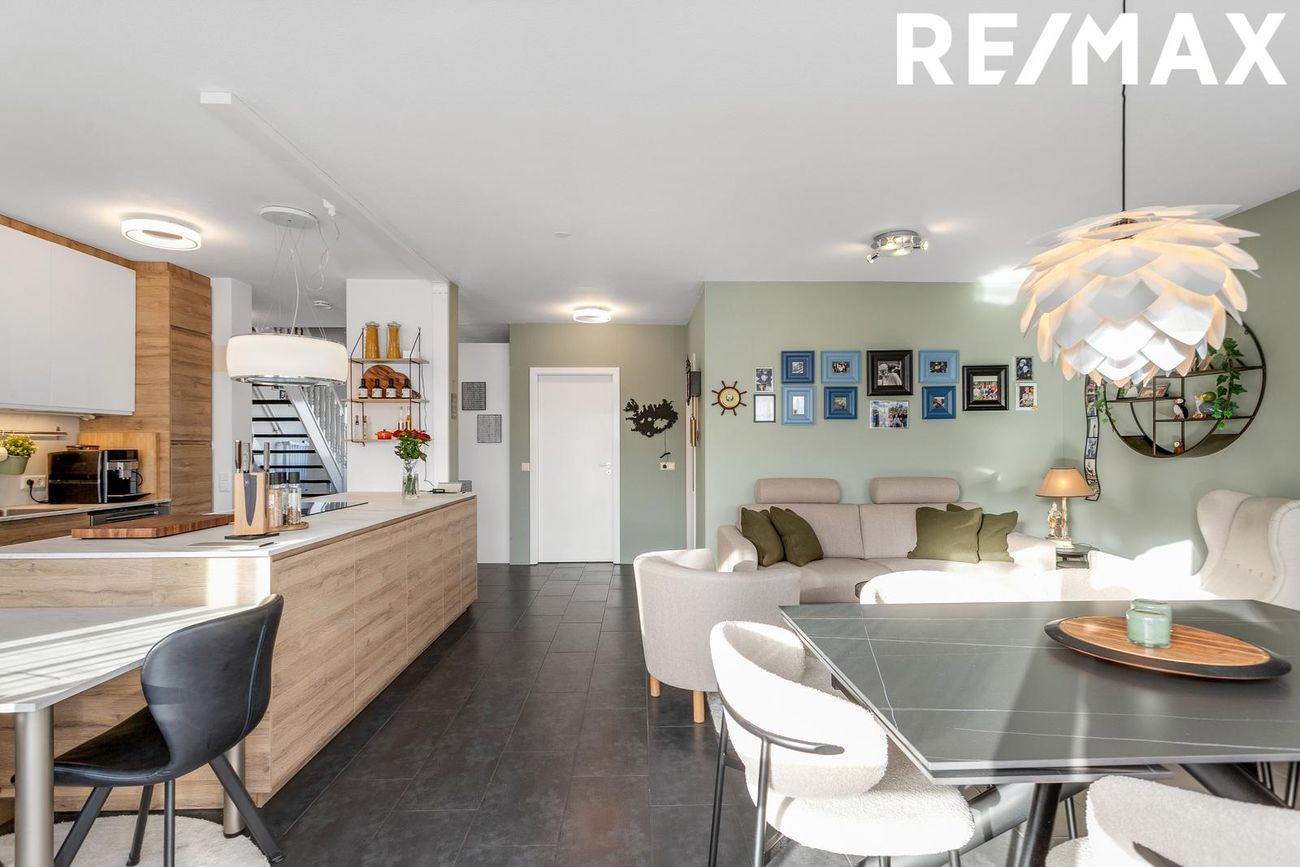 Stofa og borðstofa eru bjartar og rúmgóðar í opnu rými með gluggum til suðurs og útgengi út á skjólsælar suðursvalir.