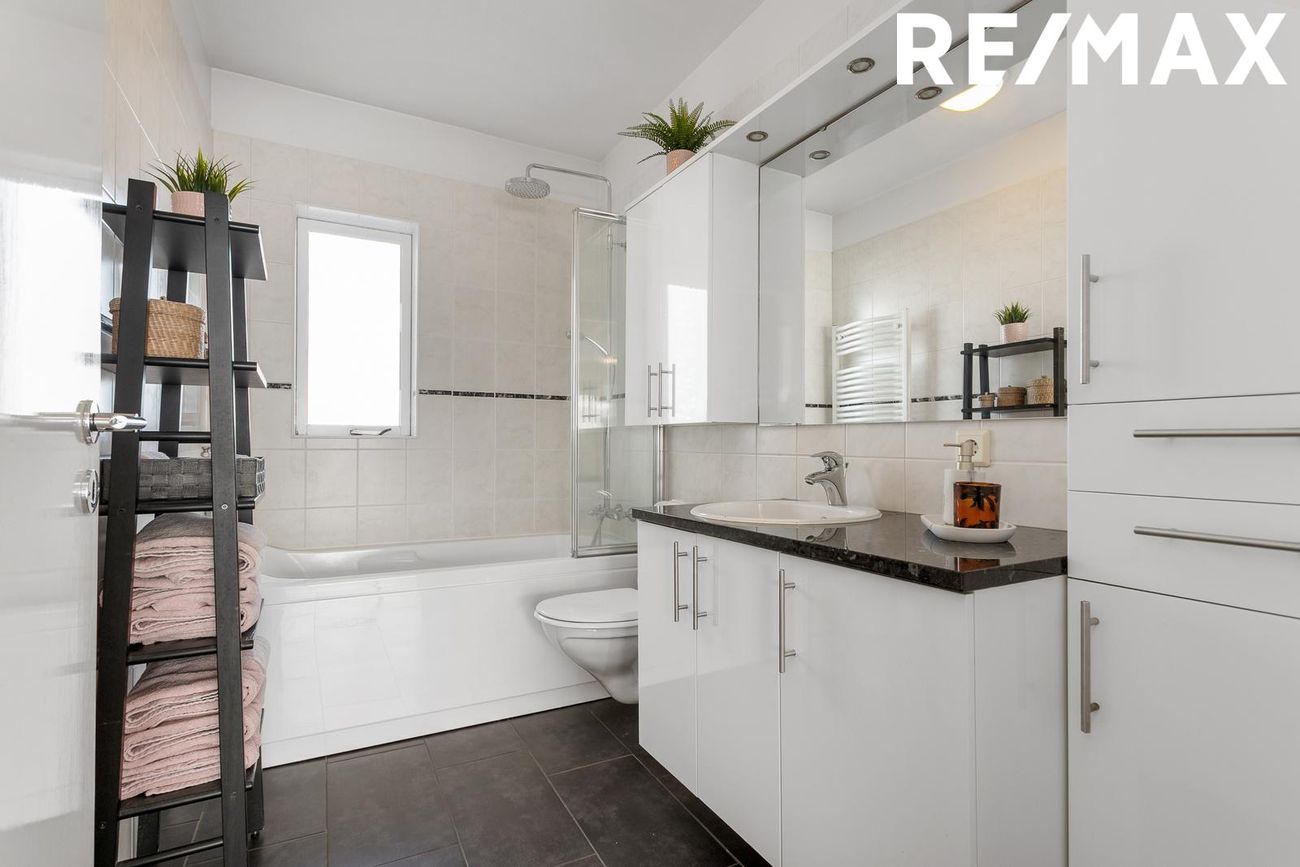 Baðherbergi er flísalagt, með gólfhita, handklæðaofni, baðkari, upphengdu salerni og innréttingu. Gluggi er með opnanlegu fagi.