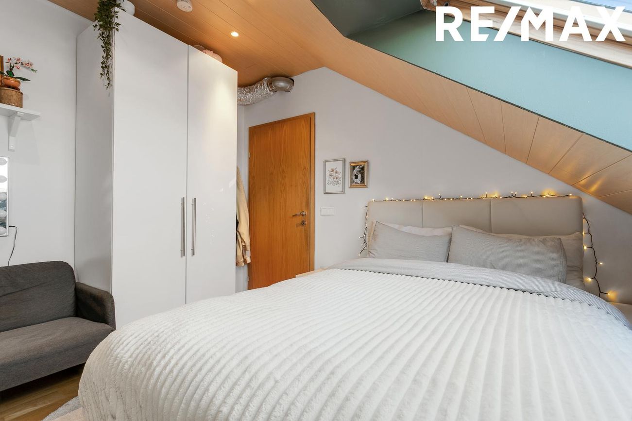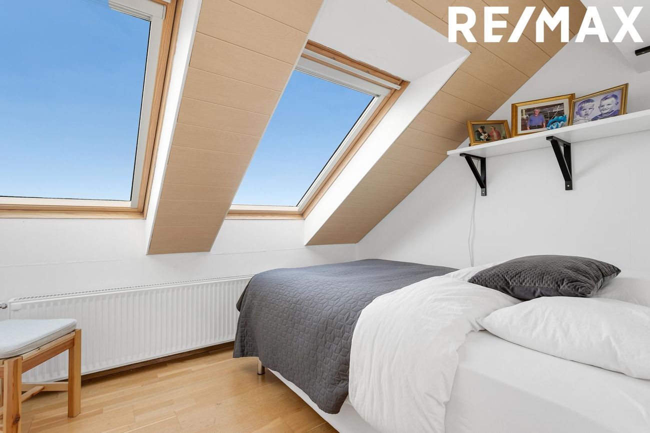 þrjú rúmgóð svefnherbergi með þakgluggum.