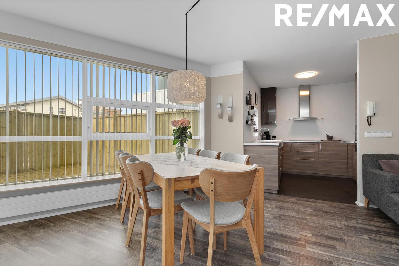 Stofa og borðstofa eru bjartar og rúmgóðar í opnu rými með gluggum til suðurs og útgengi út á skjólsælan viðarpall með girðingu. Pallurinn var stækkaður síðasta sumar og nær fram fyrir stofuglugga.