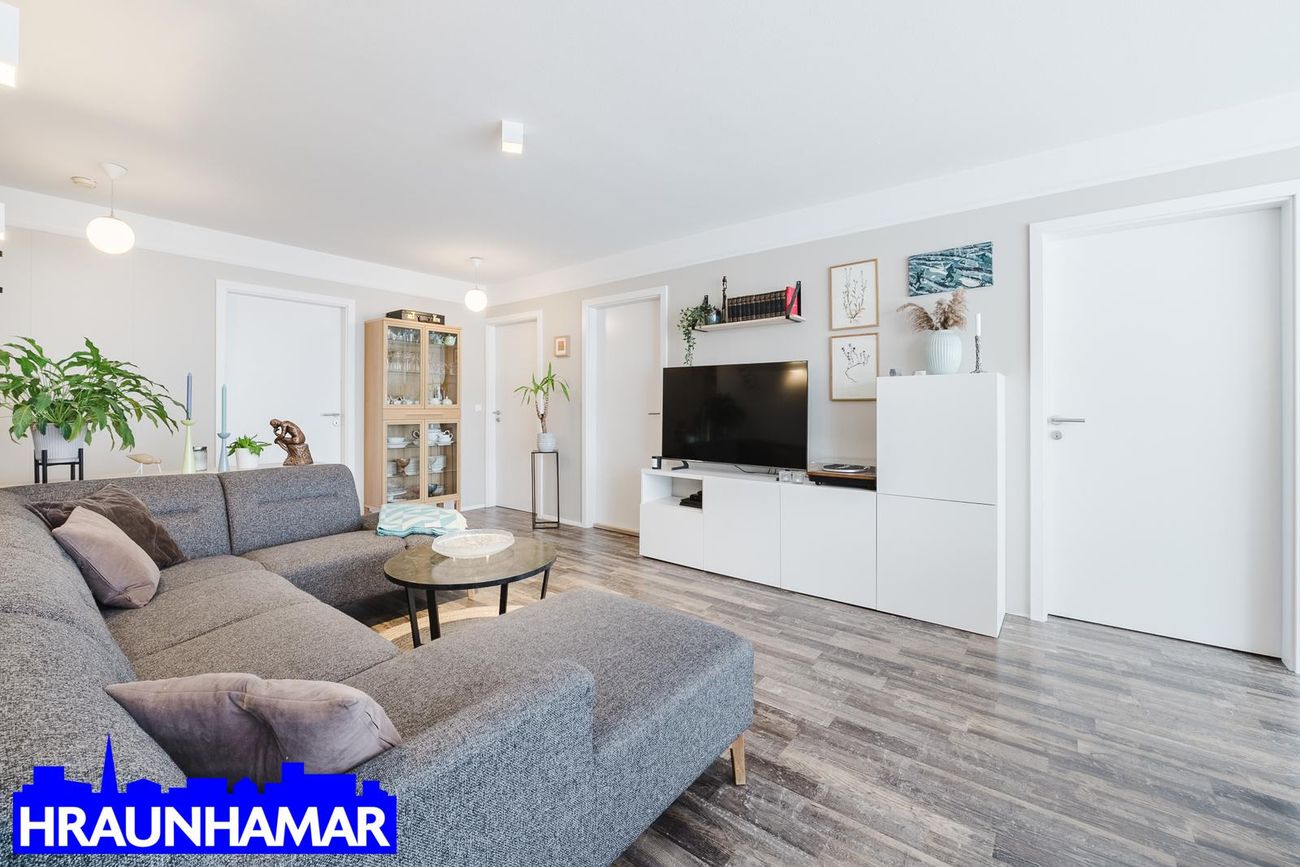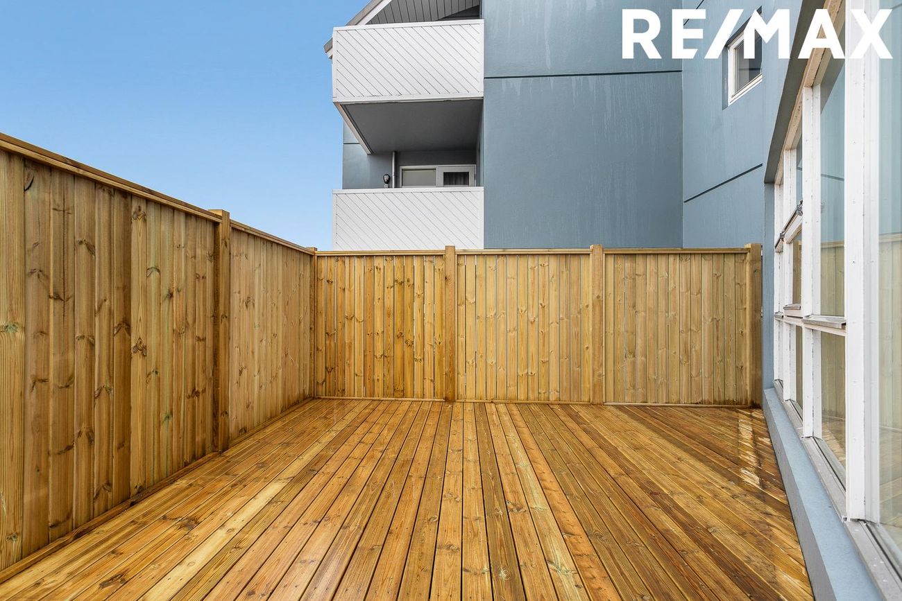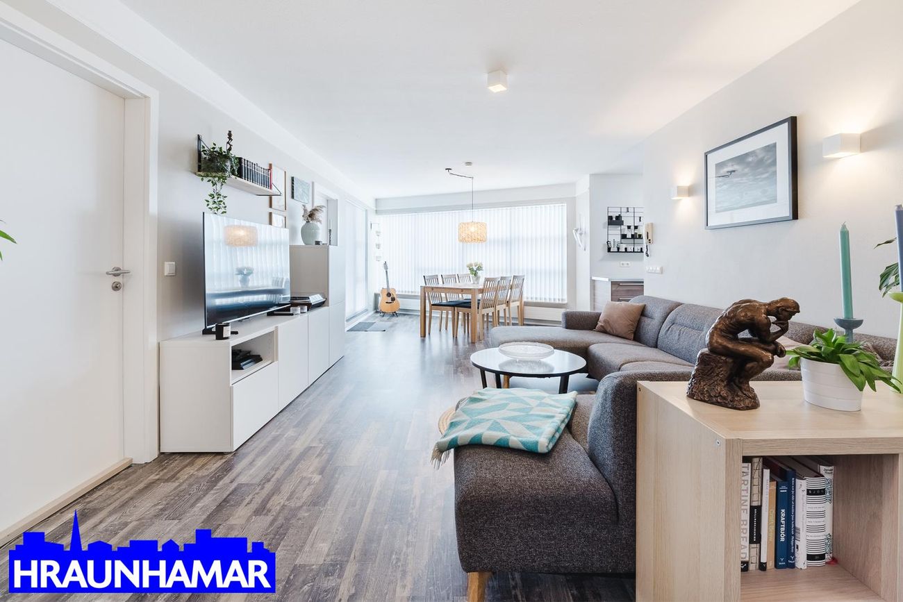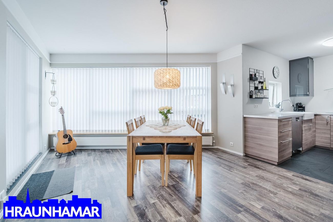 Stofa og borðstofa eru bjartar og rúmgóðar í opnu rými með gluggum til suðurs og útgengi út á skjólsælan viðarpall með girðingu. Pallurinn var stækkaður síðasta sumar og nær fram fyrir stofuglugga.