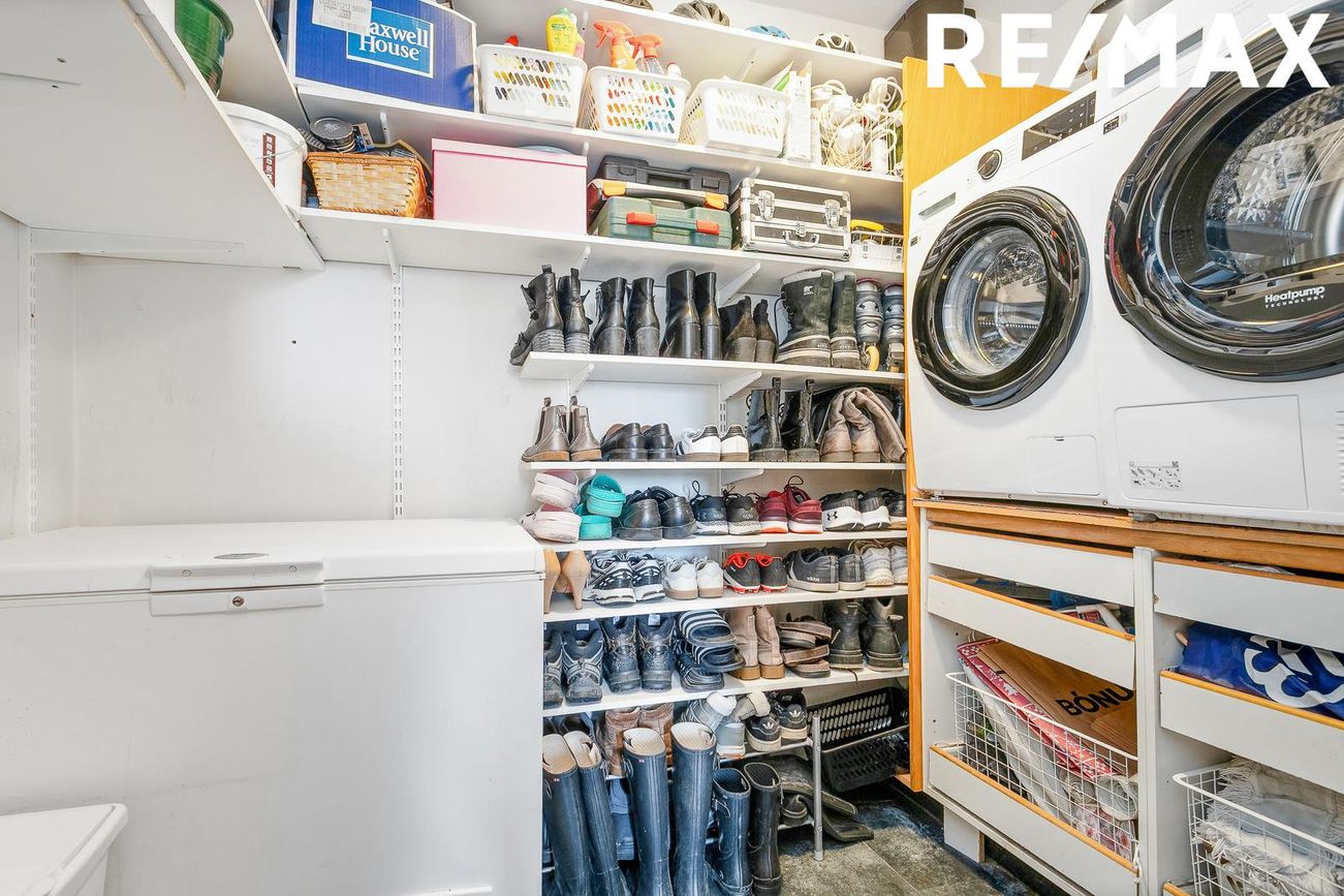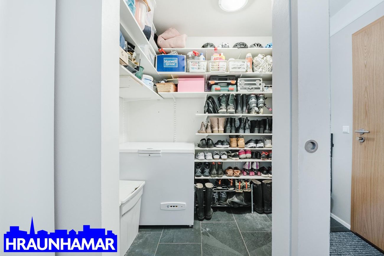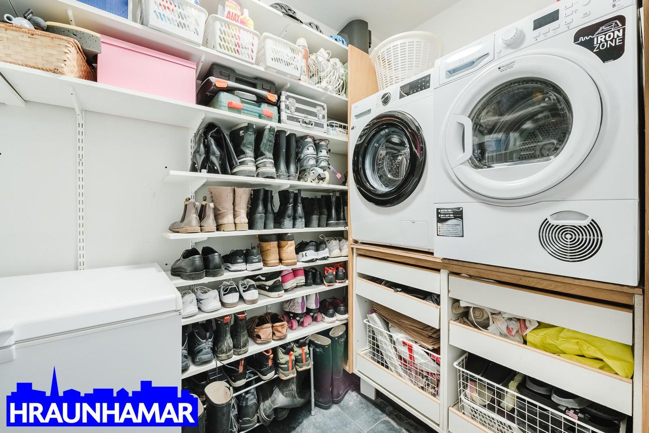 geymsla og þvottarými með aðstöðu fyrir þvottavél/þurrkara, rennihurð skilur að forstofu og þetta rými.