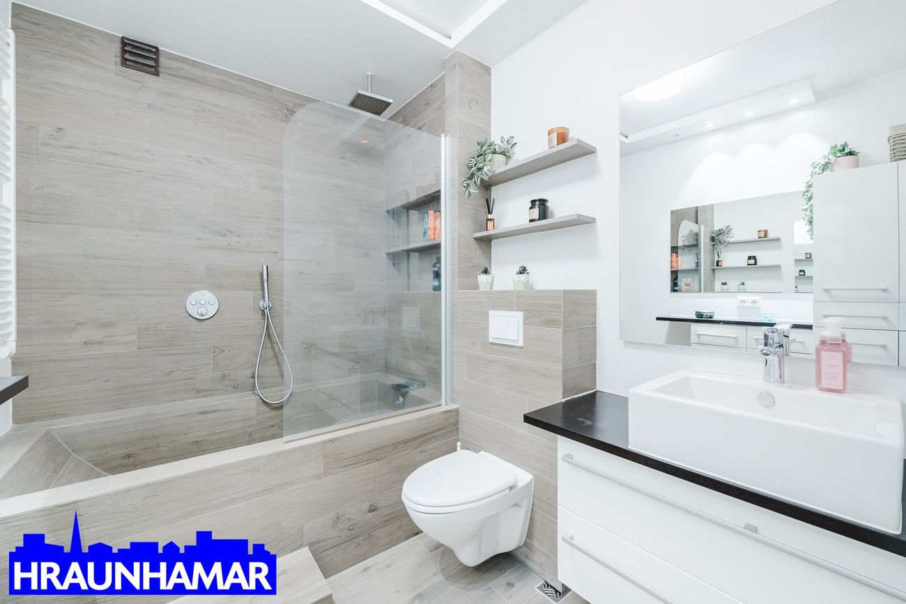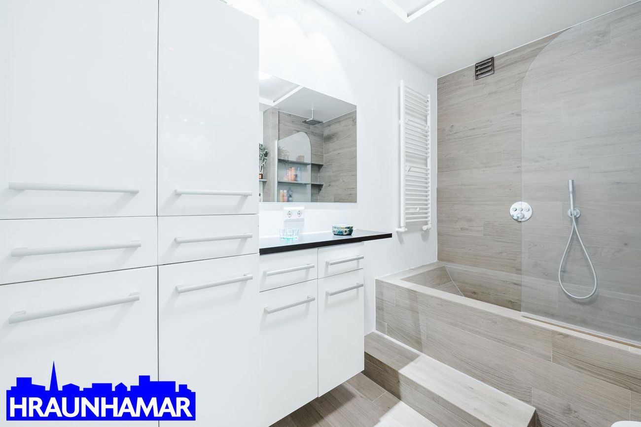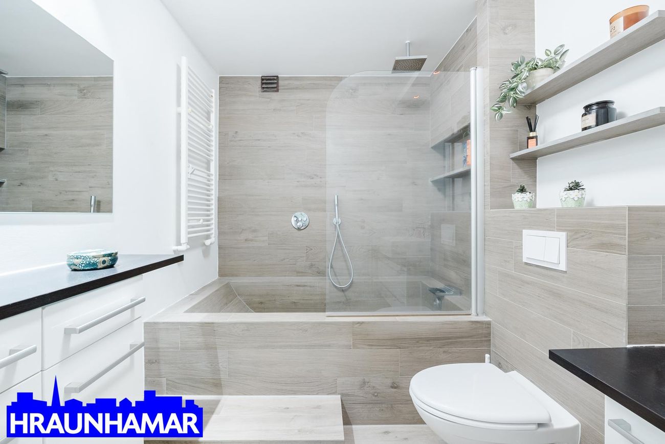 Baðherbergið er flísalagt, ný innrétting og blöndunartæki - handklæðaofn, baðkar/sturta flísalögð og upphengt salerni.