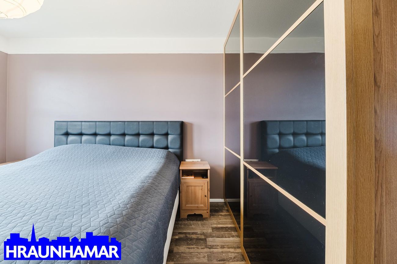 Hjónaherbergi er með parketi á gólfi og góðum fataskápum.