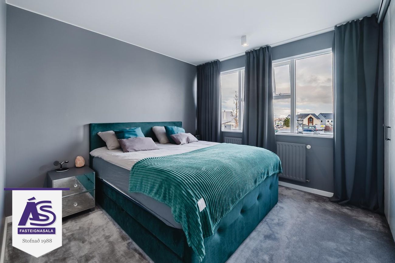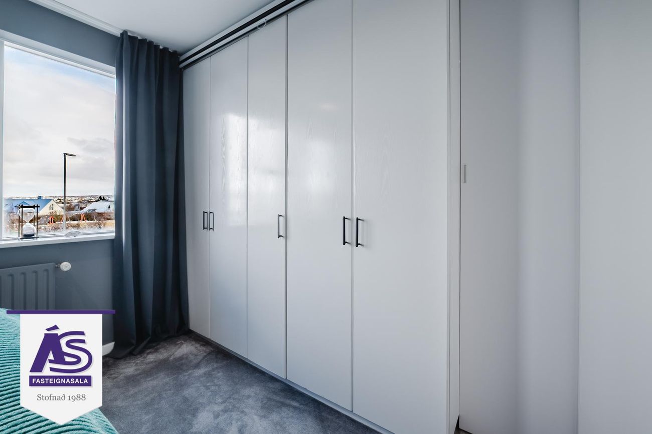 Svefnherbergi mjög rúmgott með mjög góðu skápaplássi, fallegt teppi á gólfi.