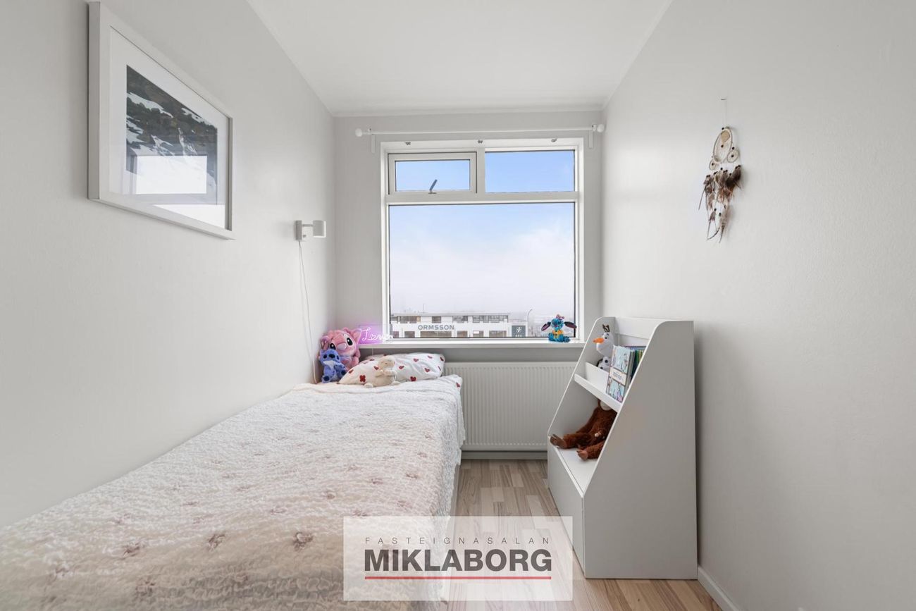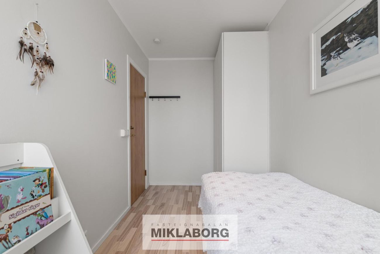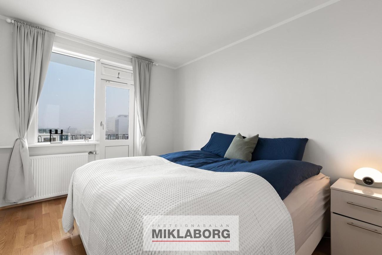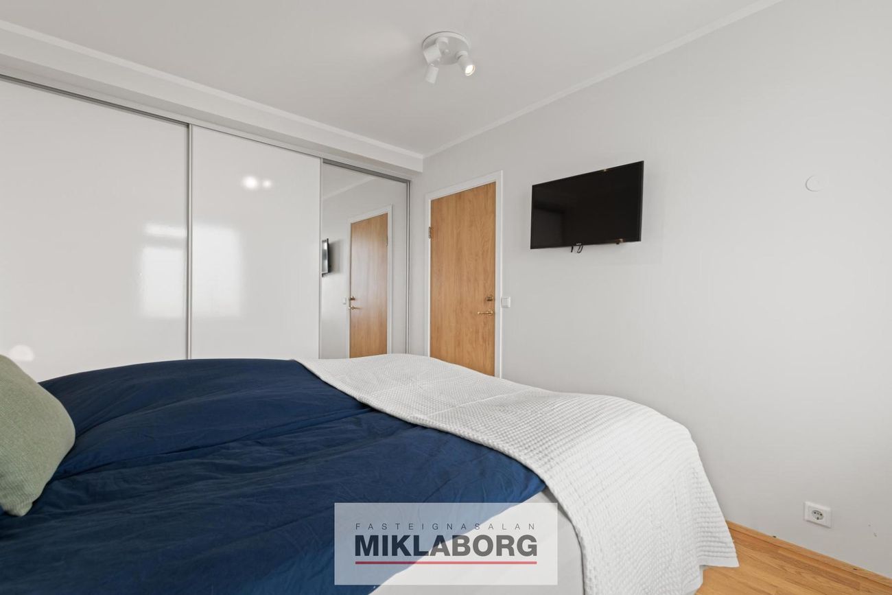 Hjónaherbergi með parket á gólfi. Nýlegur sérsmiðaður fataskápur frá HTH. Útgengt út á svalir með glæsilegu útsýni í átt að Esjunni.
