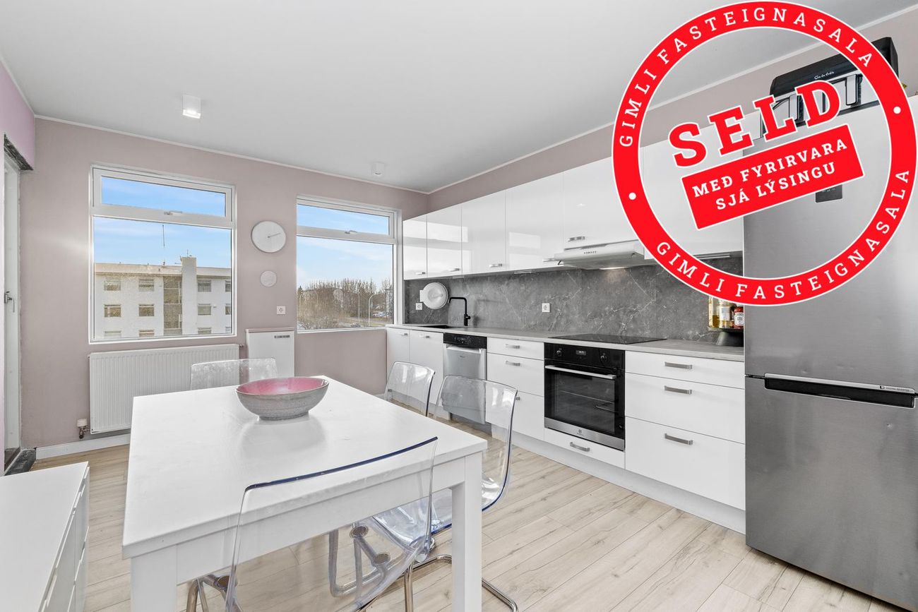 Miklaborg kynnir: Virkilega falleg og björt fjögurra herbergja íbúð á þriðju hæð við Álftamýri 6, Reykjavík. Skv. skráningu HMS er eignin samtals 139,9 fm að stærð og skiptist í íbúðarými 100,5 fm, tvennar geymslur 11,3 fm og 5,6 fm og bílskúr 22,5 fm. Íbúðin skiptist í forstofu, eldhús, stofu/borðstofu, baðherbergi og þrjú svefnherbergi.