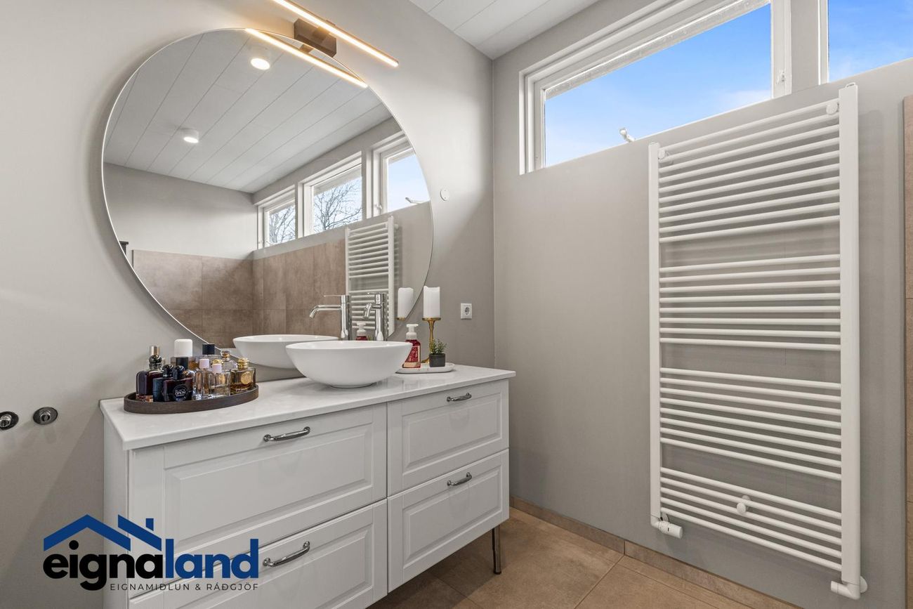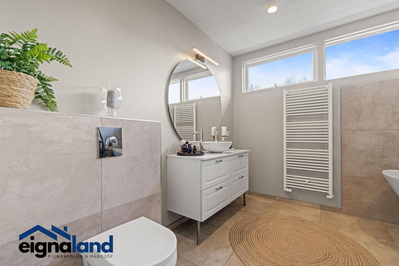 Baðherbergi: Glæsilegt baðherbergi sem var endurnýjað árið 2020. Frístandandi baðkar og einnig er sturtuklefi. Smekkleg hvítlökkuð innrétting, upphengt wc og handklæðaofn. Flísar eru á gólfi og veggjum.