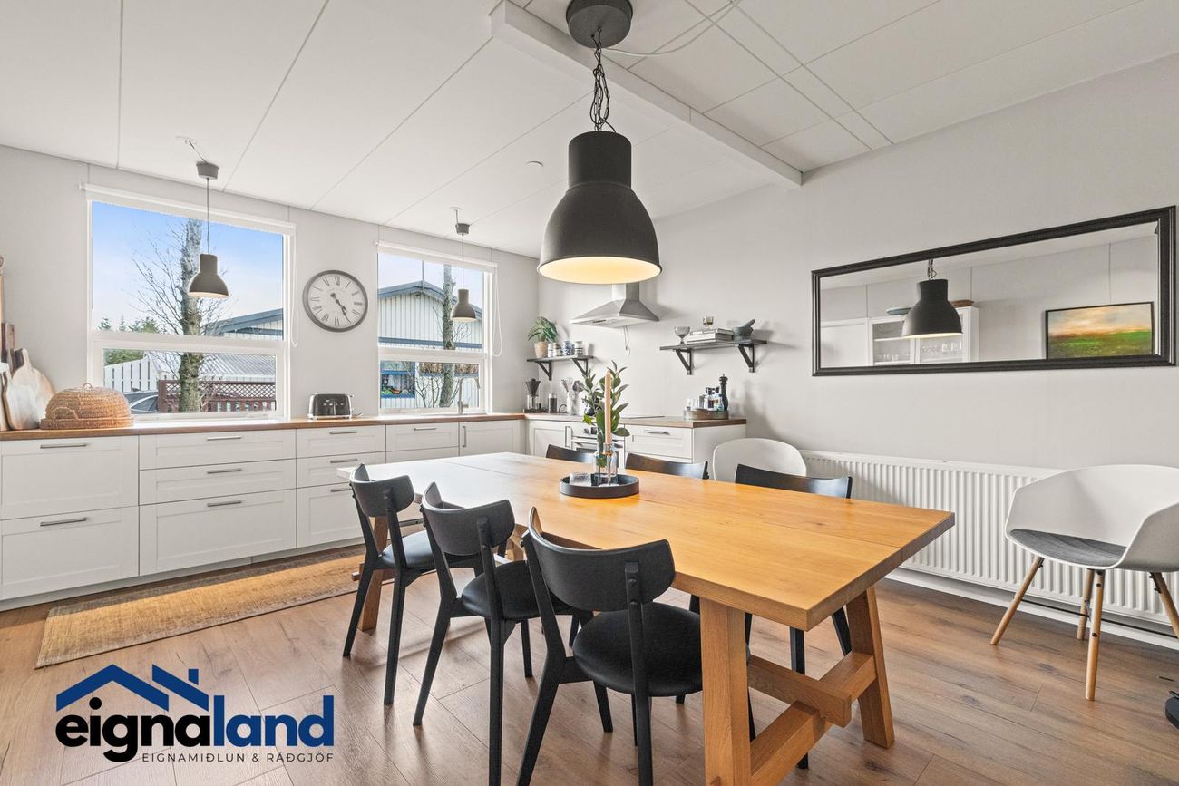 Eldhús/borðstofa/alrými: Falleg og bjart rými, þar sem borðstofan og eldhúsið er "hjartað" Falleg eldhúsinnrétting, hvvítlökkuð með eikarplötu, með góðu skápaplássi.