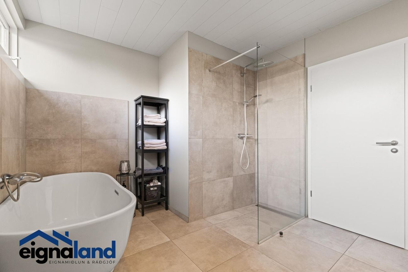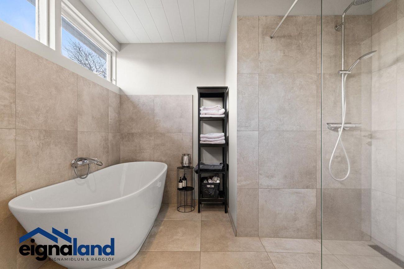 Baðherbergi: Glæsilegt baðherbergi sem var endurnýjað árið 2020. Frístandandi baðkar og einnig er sturtuklefi. Smekkleg hvítlökkuð innrétting, upphengt wc og handklæðaofn. Flísar eru á gólfi og veggjum.