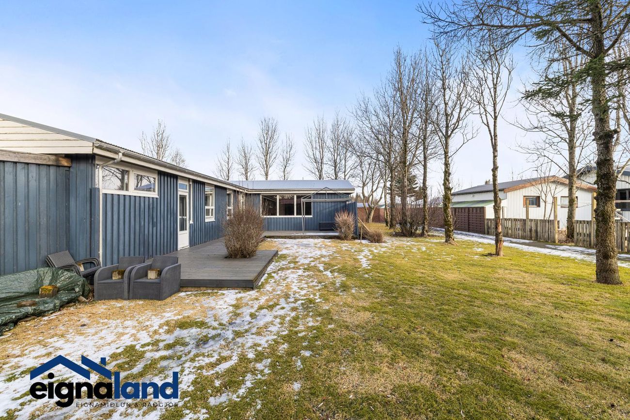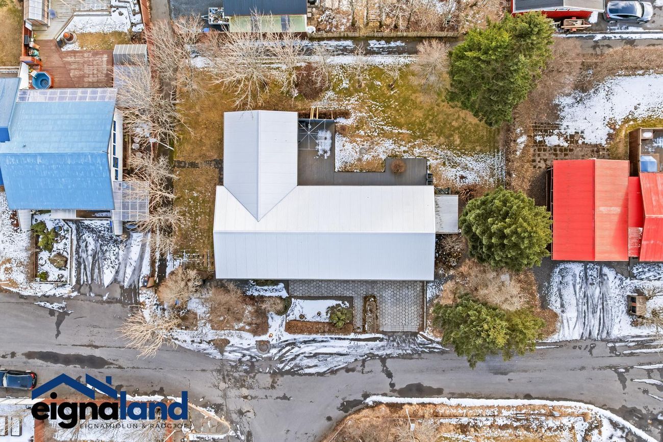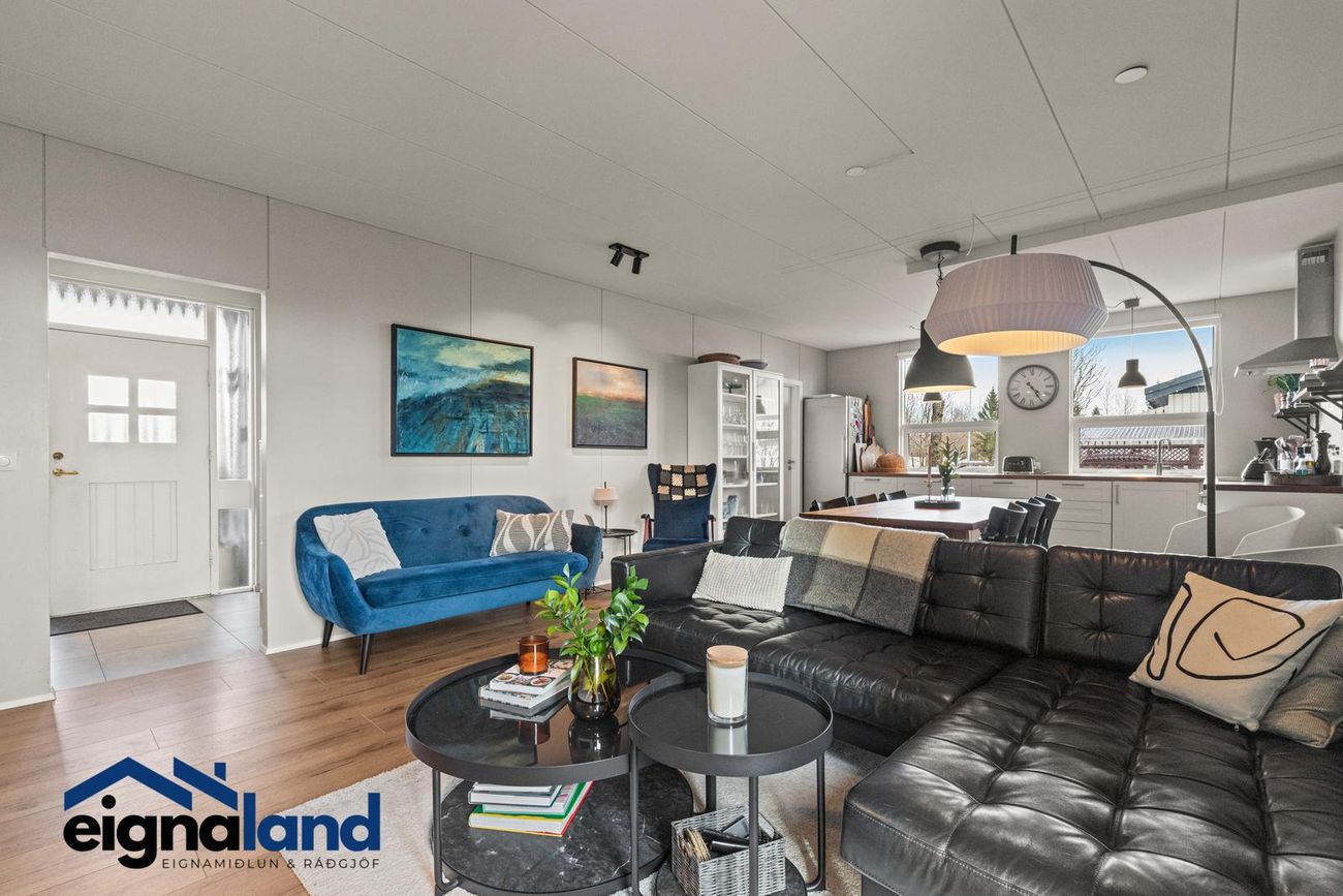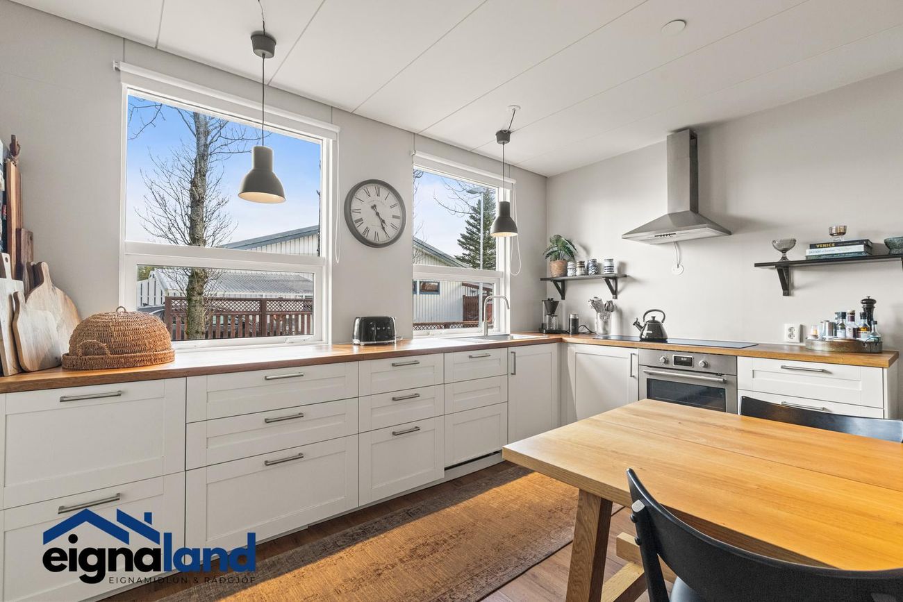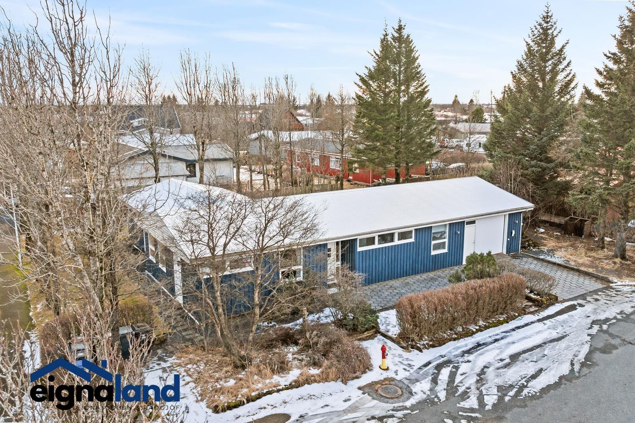 Um er að ræða 205 m2 einbýli sem skiptist í 125 m2 íbúð með fjórum svefnherbergjum, 40 m2 aukaíbúð með tveimur svefnherbergjum og innbyggðum 40 m2 bílskúr.