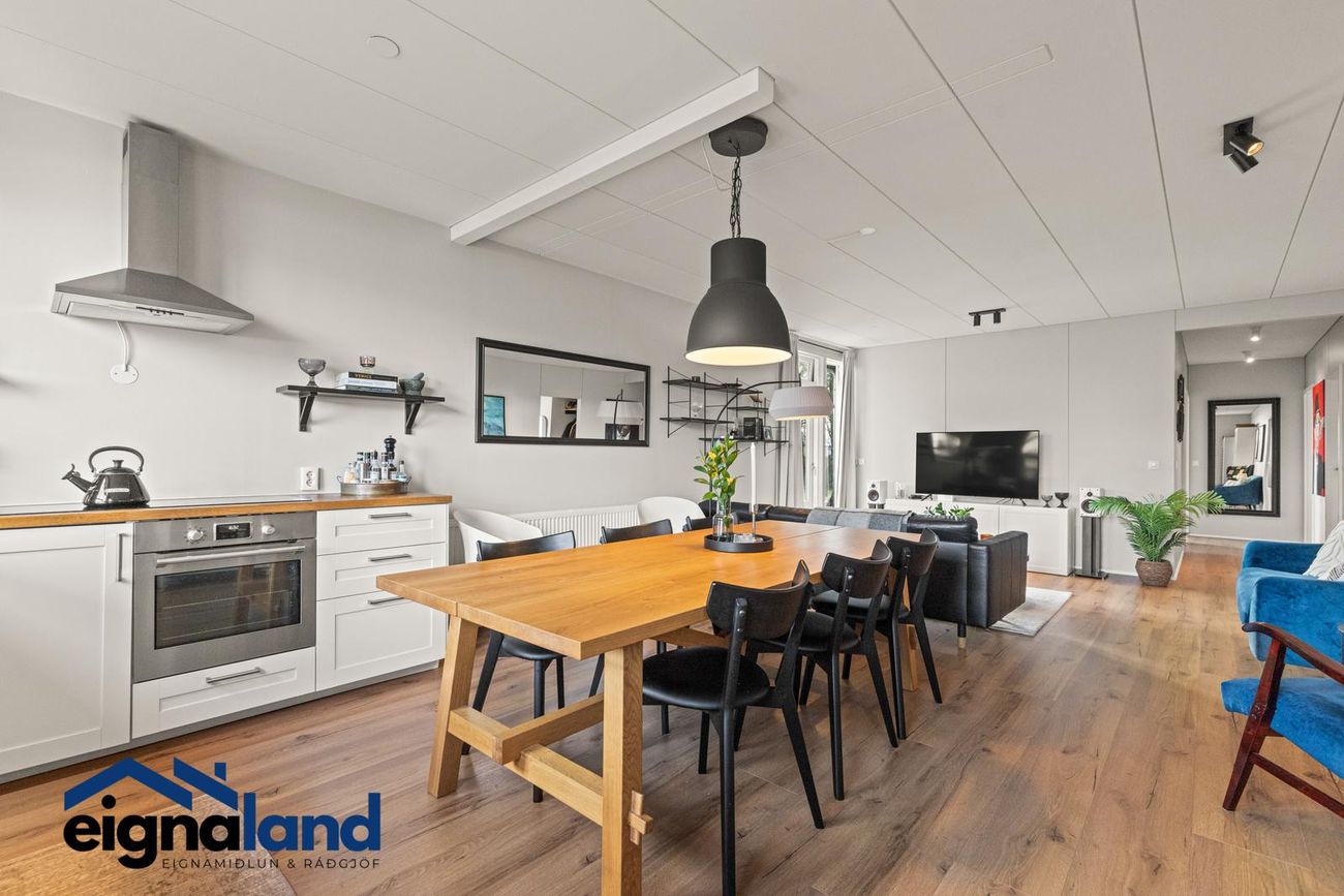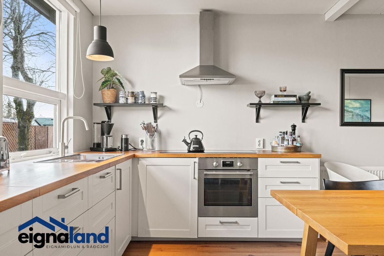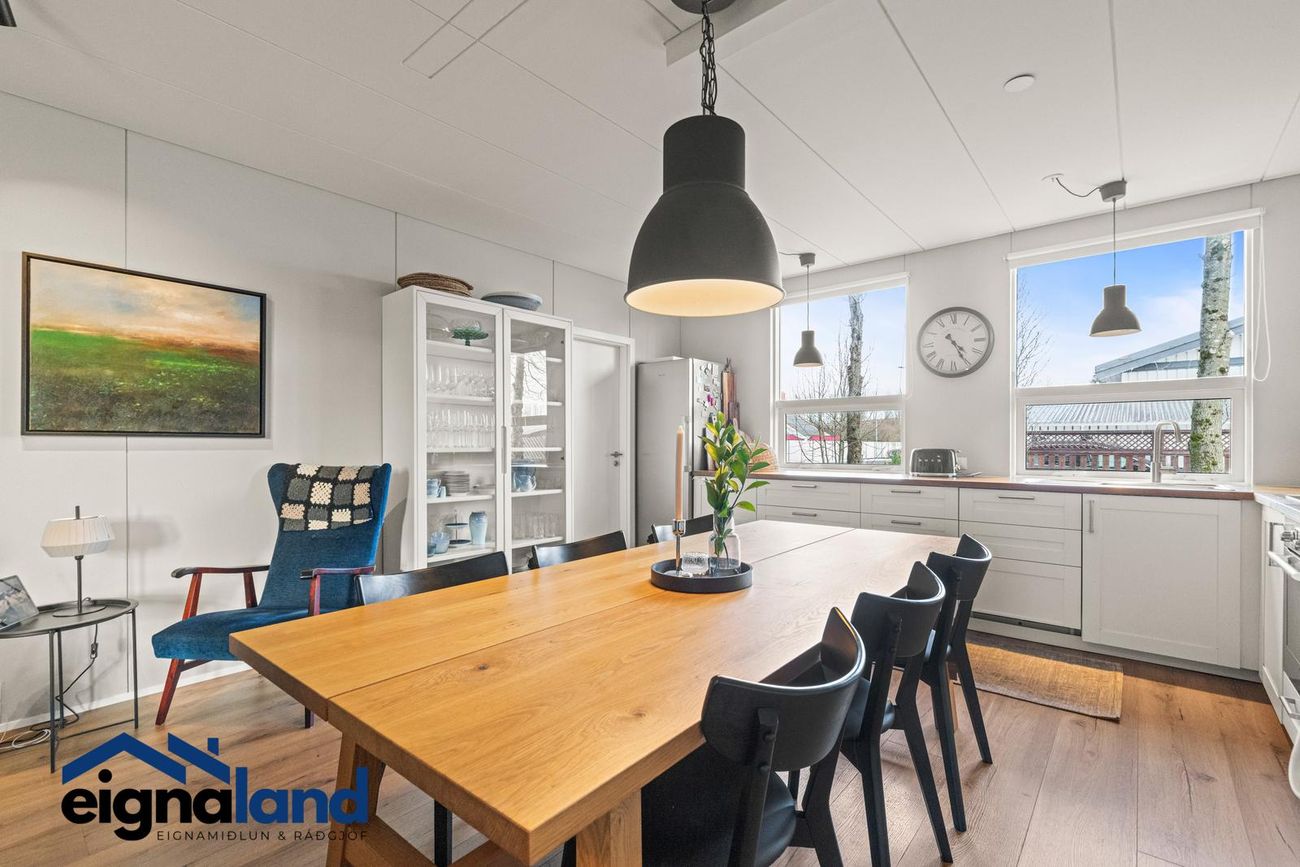 Eldhús/borðstofa/alrými: Falleg og bjart rými, þar sem borðstofan og eldhúsið er "hjartað" Falleg eldhúsinnrétting, hvvítlökkuð með eikarplötu, með góðu skápaplássi.
