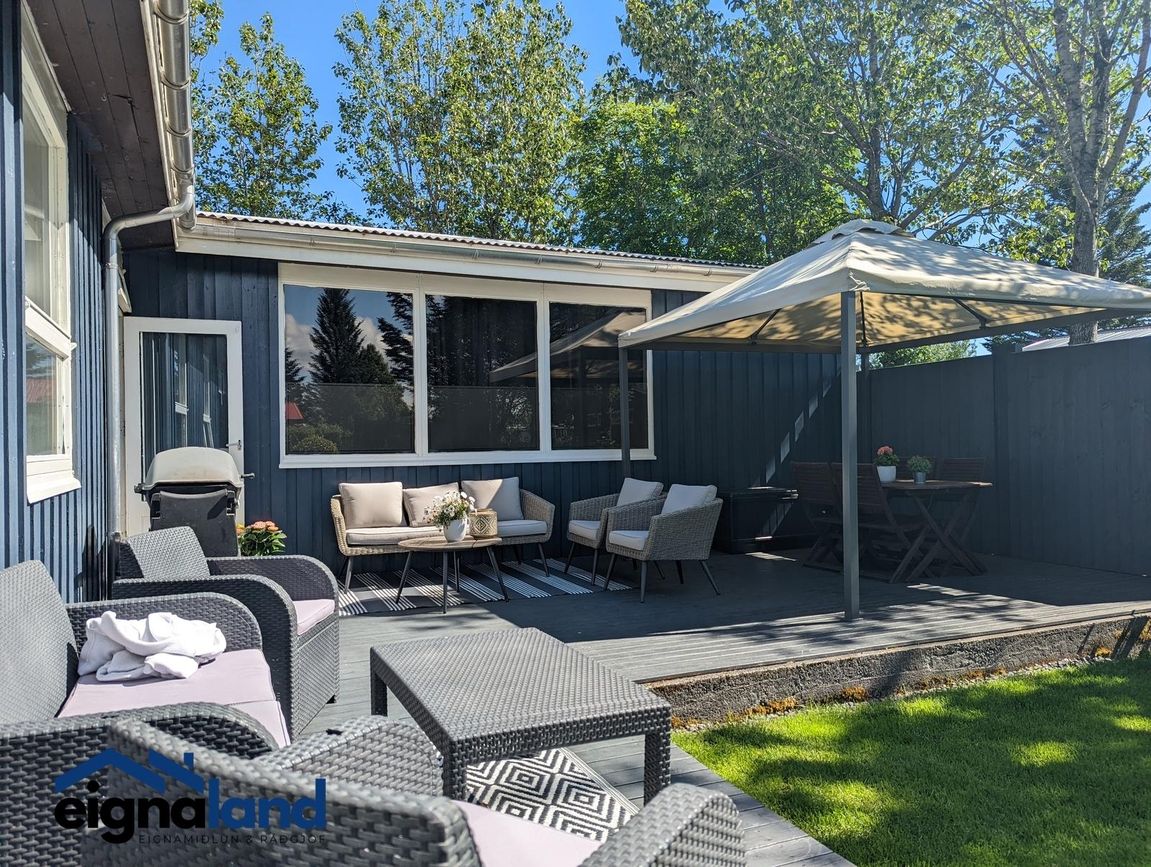 Garður: Gróinn garður með góðum sólpalli, sem snýr í suður. Árið 2020, var lóðin graslögð að nýju.