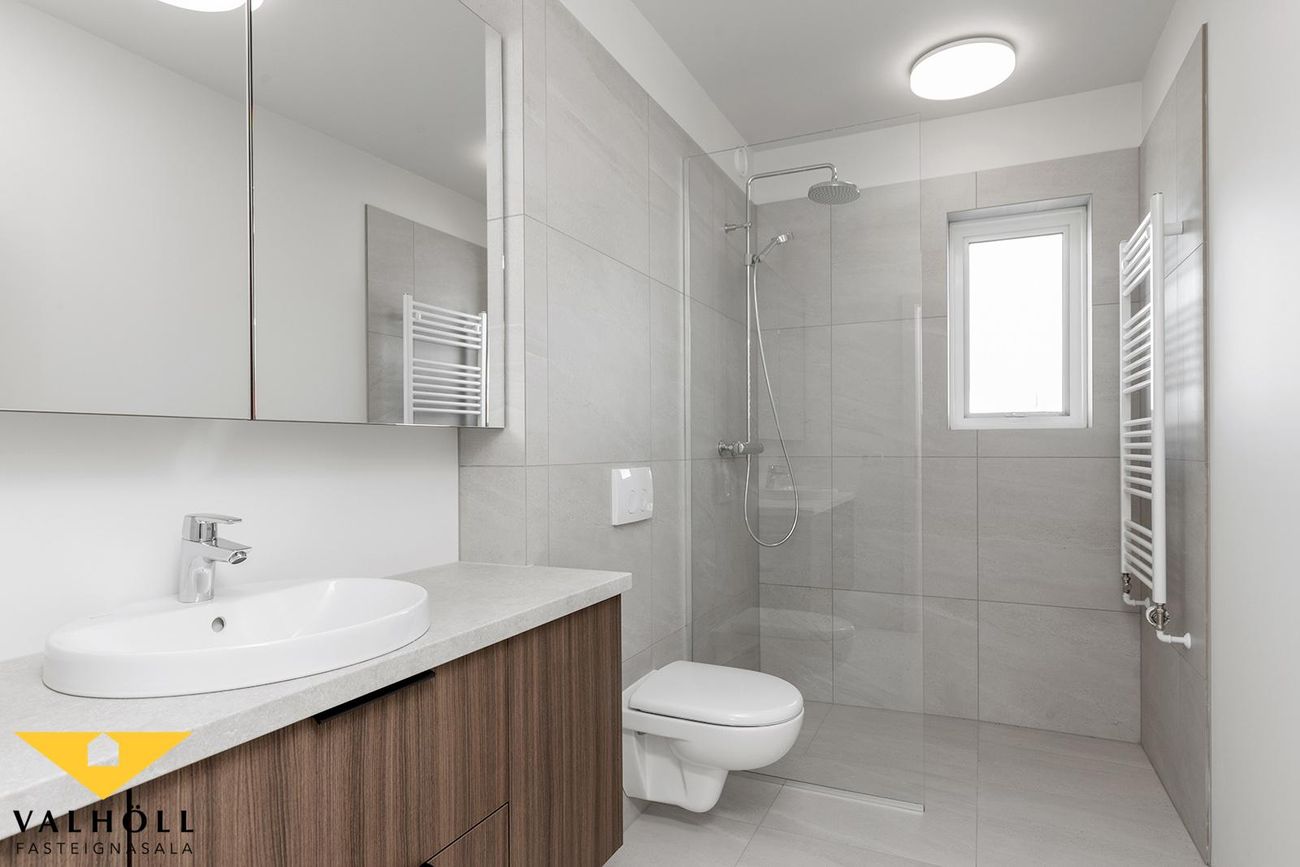 Baðherbergi: Flísalagt með möttum ljósum flísum „Limestone Ice 61x61. Með rúmgóðri vaskinnréttingu, upphengdu salerni, "walk in" sturtu. Baðinnréttingar eru með dökkri viðaráferð K547 með tveimur skúffum undir vaski og speglaskáp yfir vaski, frá Parka ehf. Borðplata er HPL plast K209. Lamir eru með ljúflokun.