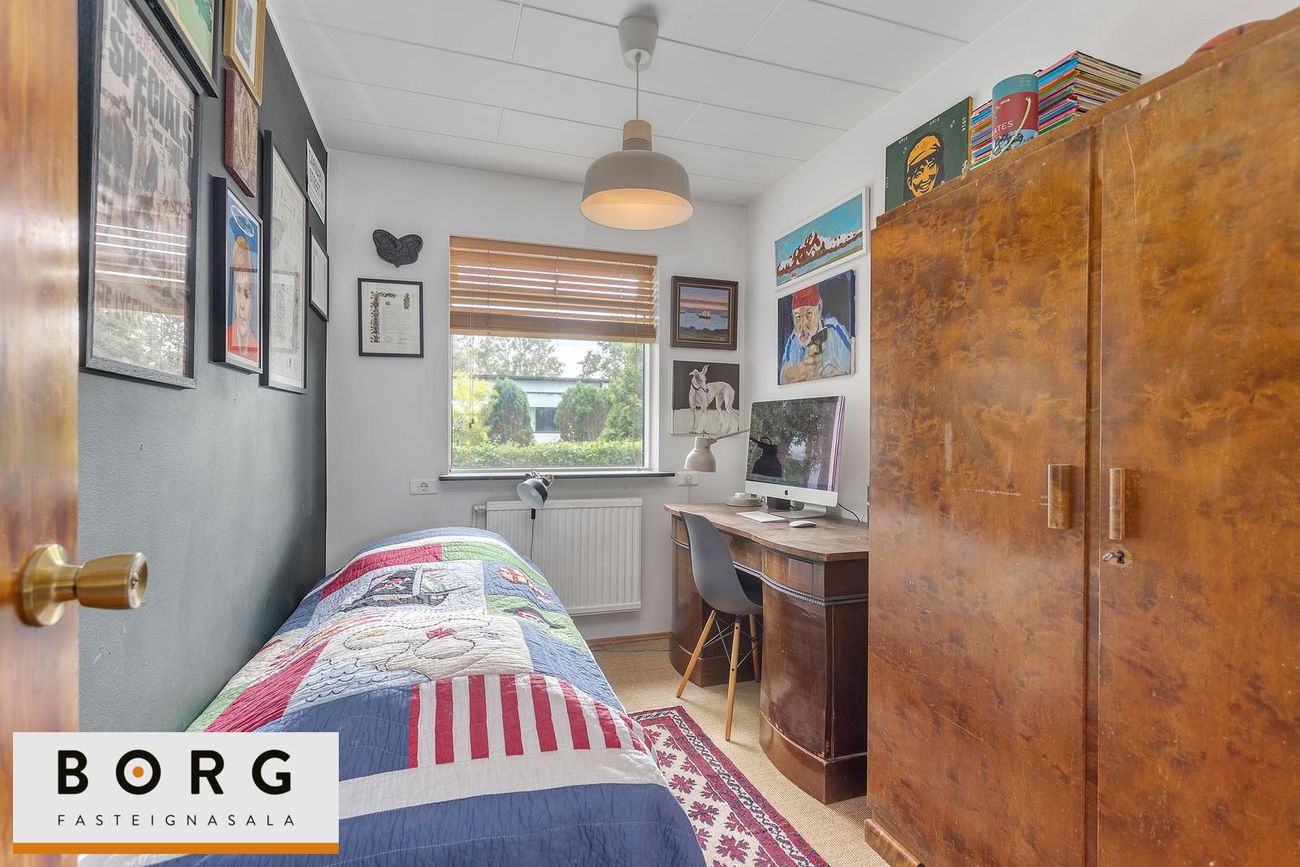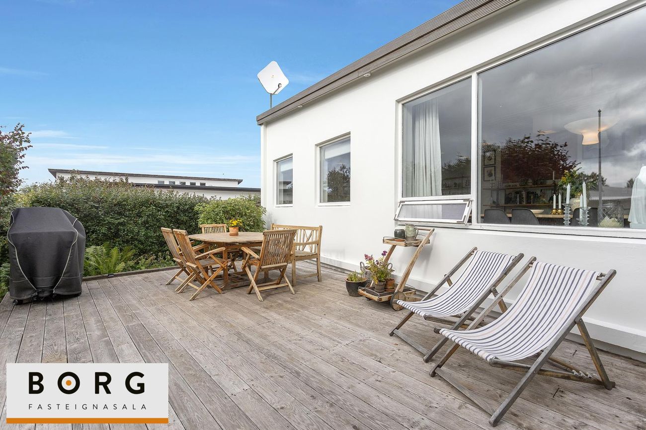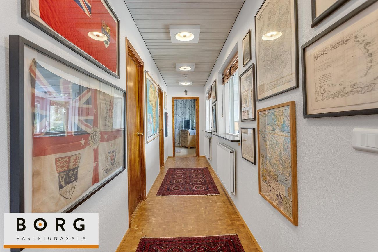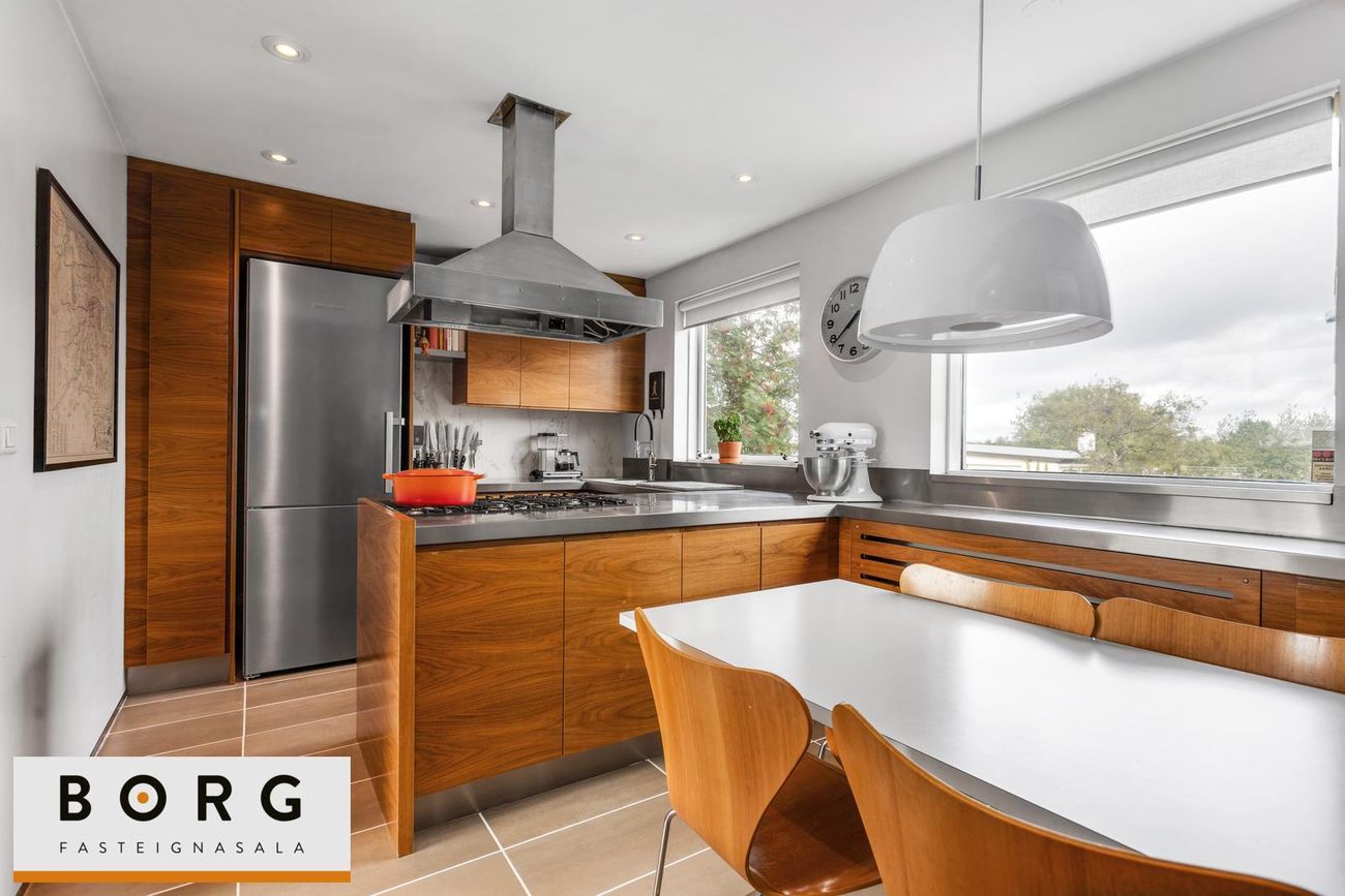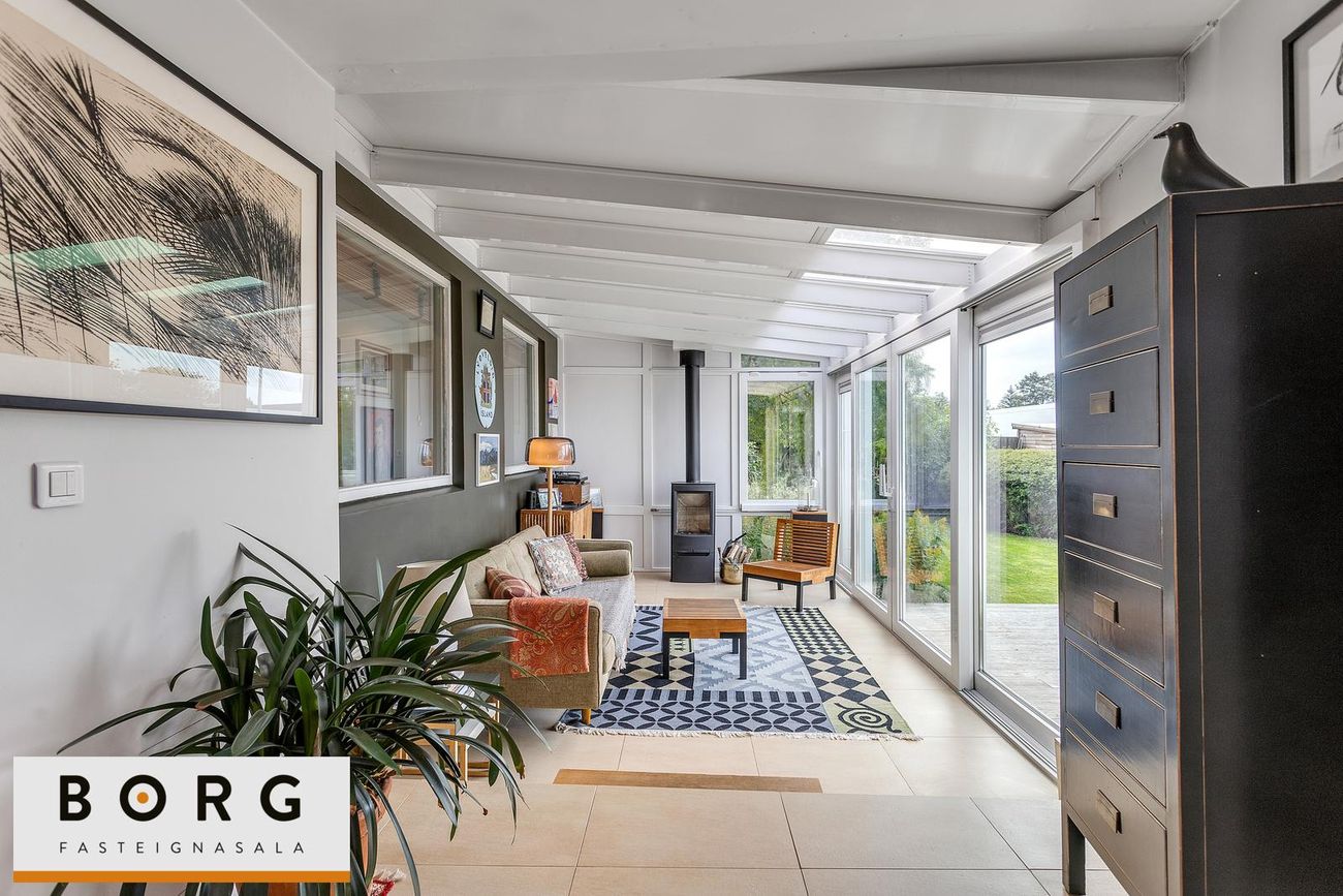 Komið er inn í anddyri sem er miðja hússins, á vinstri hönd er þvottahús, geymsla og minna baðherbergið. Beint af augum er svefngangurinn, þar er baðherbergi, þrjú barnaherbergi og hjónaherbergi inn í enda. Sólstofa er fyrir miðju og tengir húsið og garðinn skemmtilega saman. Eldhús, borðstofa og stofa eru í sérlega fallegu rými, björtu og hlýlegu.