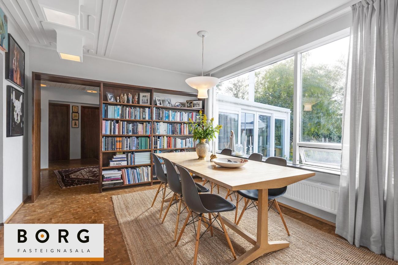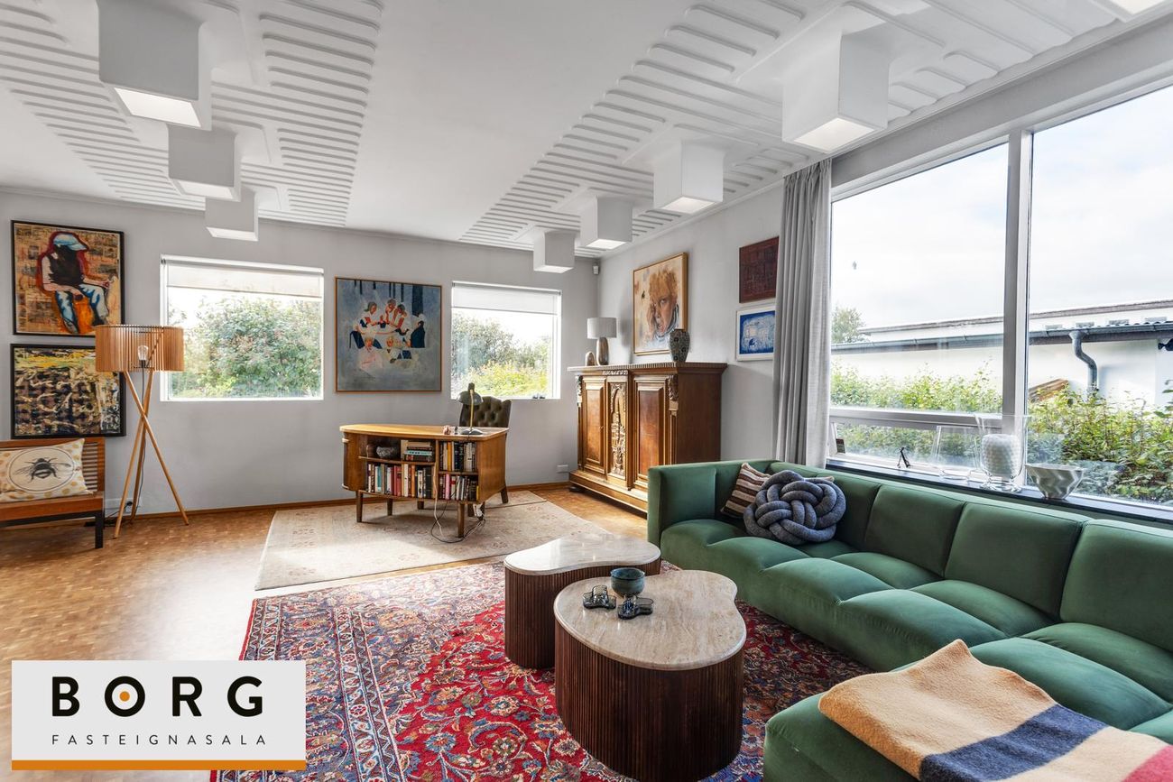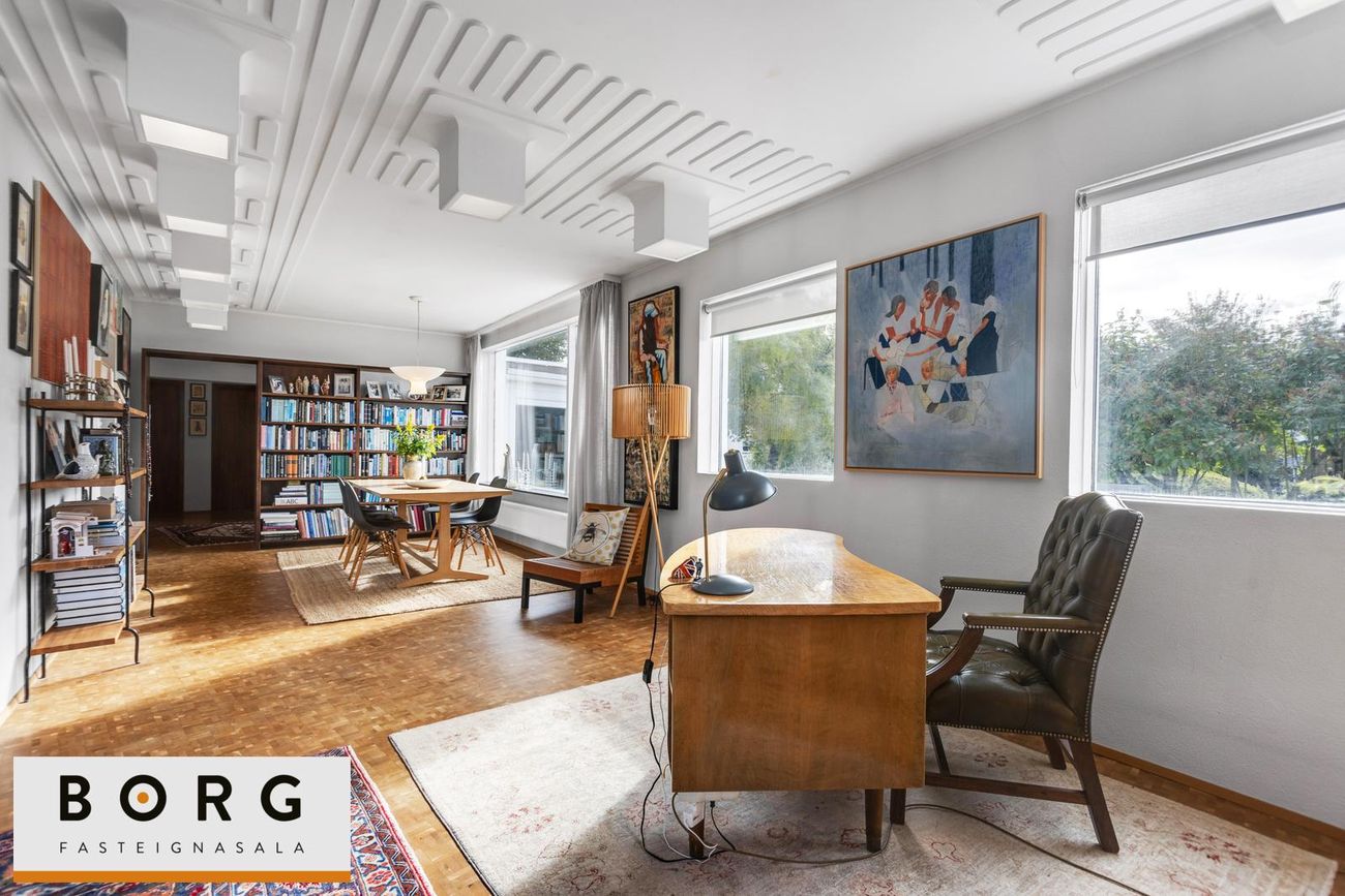 Loftið þar er einstakt í “seventíes anda” enda sérhannað á sínum tíma af Pétri B. Lúterssyni arkitekt og húsgagnahönnuði.
